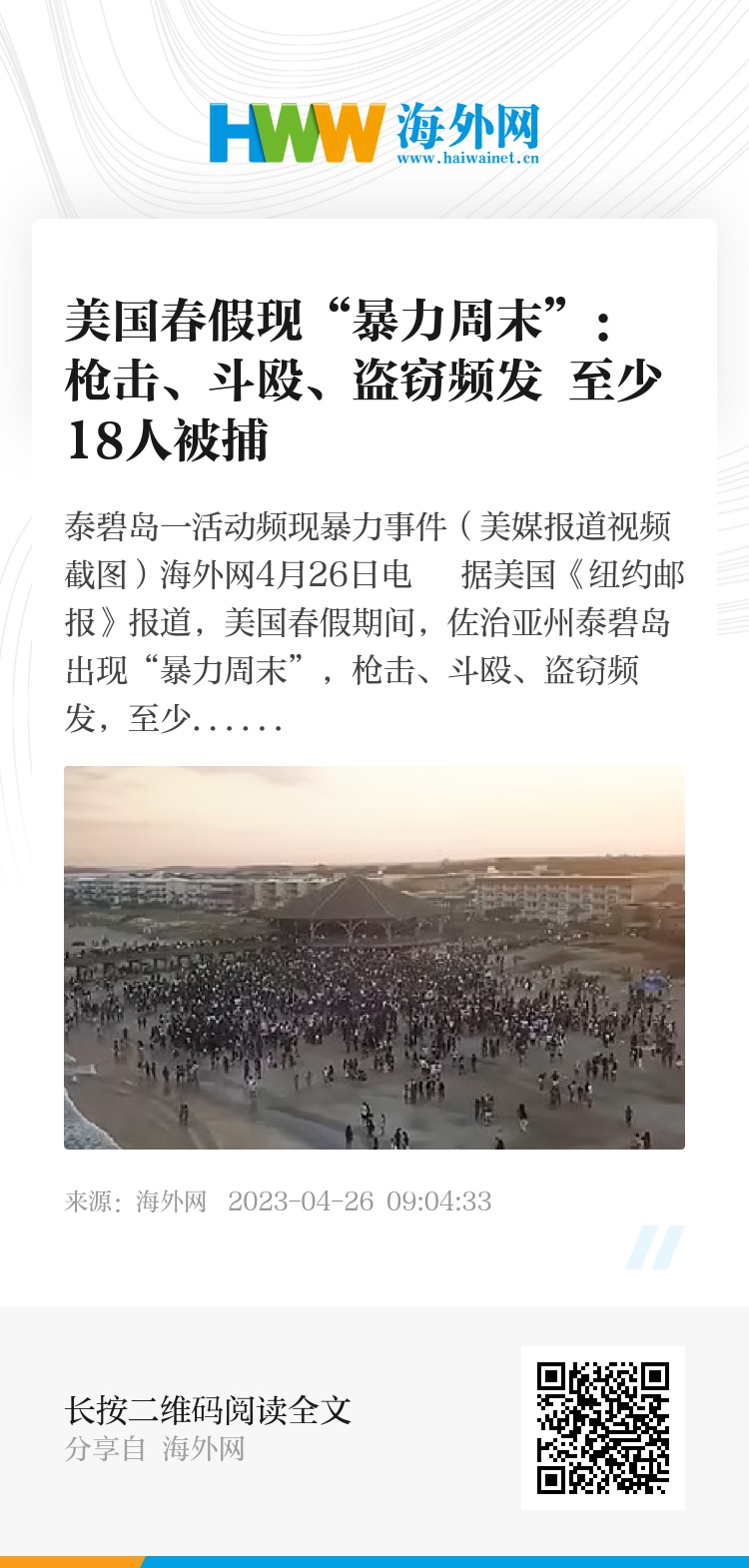 《纽约邮报》称,此次活动在20世纪90年代就因频现暴力事件而臭名昭著。泰碧岛官员表示,今年的活动规模太大,太混乱了。(海外网 李萌)