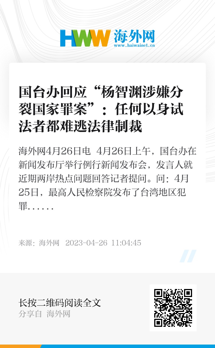 问:4月25日,最高人民检察院发布了台湾地区犯罪嫌疑人杨智渊涉嫌分裂国家罪一案办理进展。请发言人介绍有关情况。