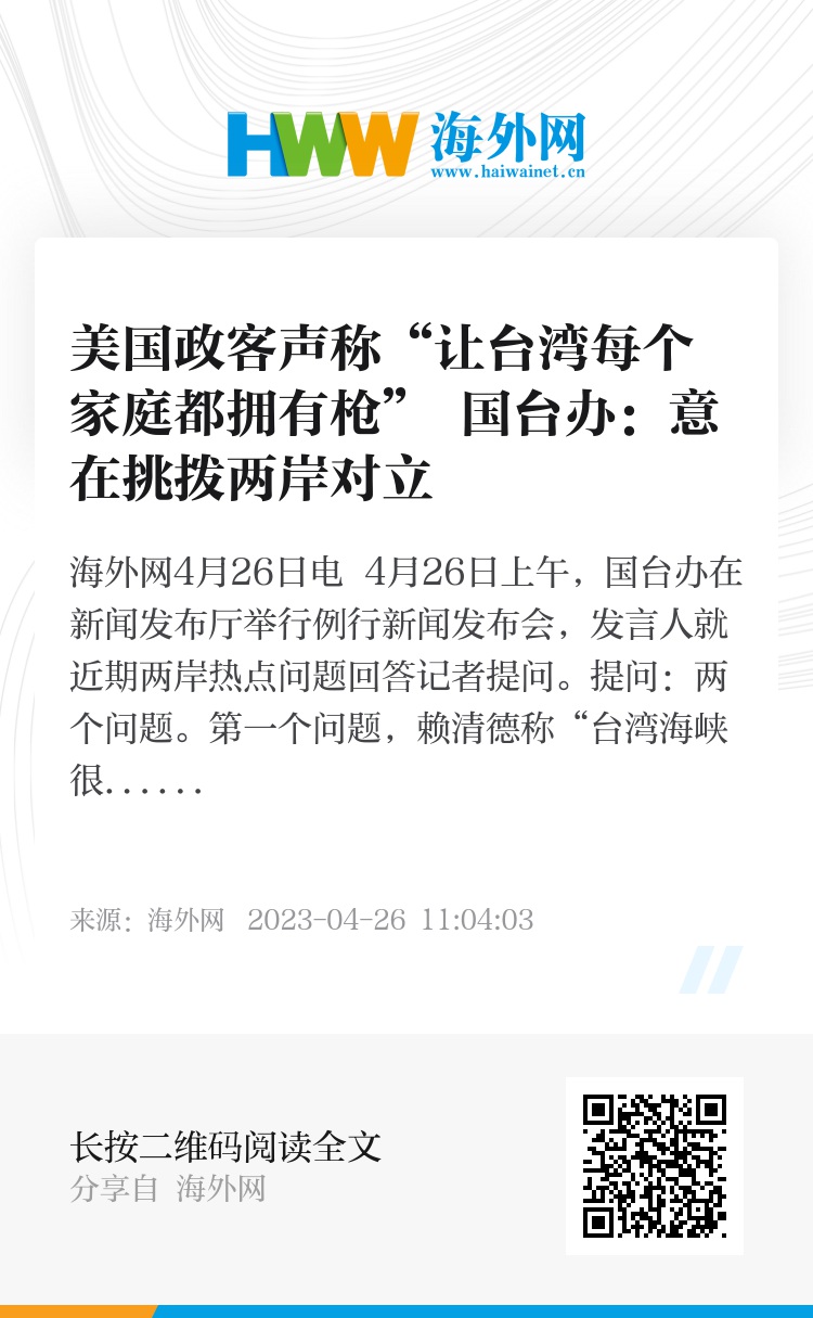 提问:两个问题。第一个问题,赖清德称“台湾海峡很宽,可以容纳台湾和大陆以‘兄弟之邦’生存发展”,请问国台办有何回应?第二个问题,美国共和党总统参选人声称,“让台湾每个家庭都拥有枪”。还有美国国会委员会进行所谓兵推,称解放军会遭到严重损失。请问国台办如何看待这样的紧张氛围?