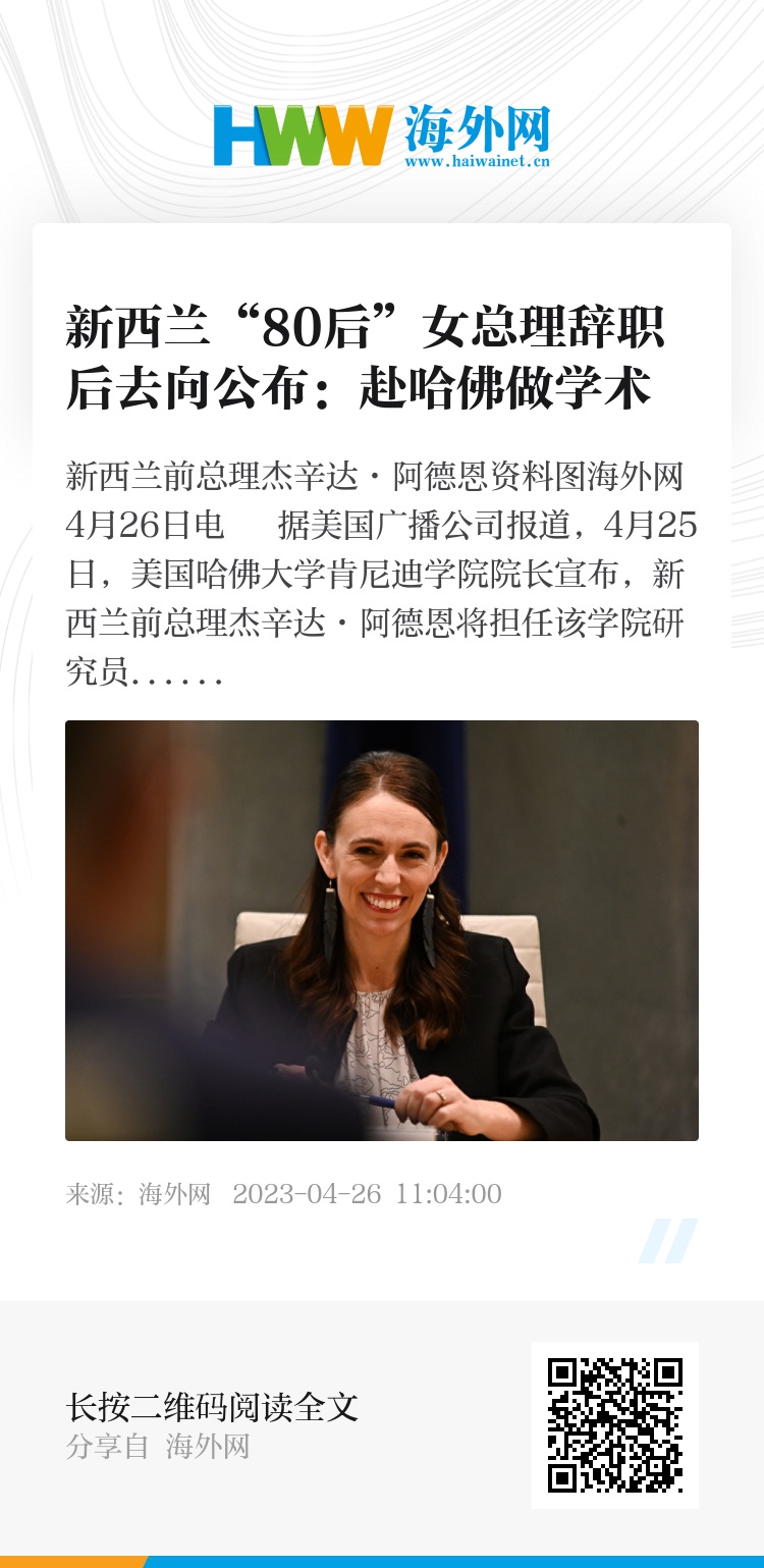 海外网4月26日电 据美国广播公司报道,4月25日,美国哈佛大学肯尼迪学院院长宣布,新西兰前总理杰辛达·阿德恩将担任该学院研究员。