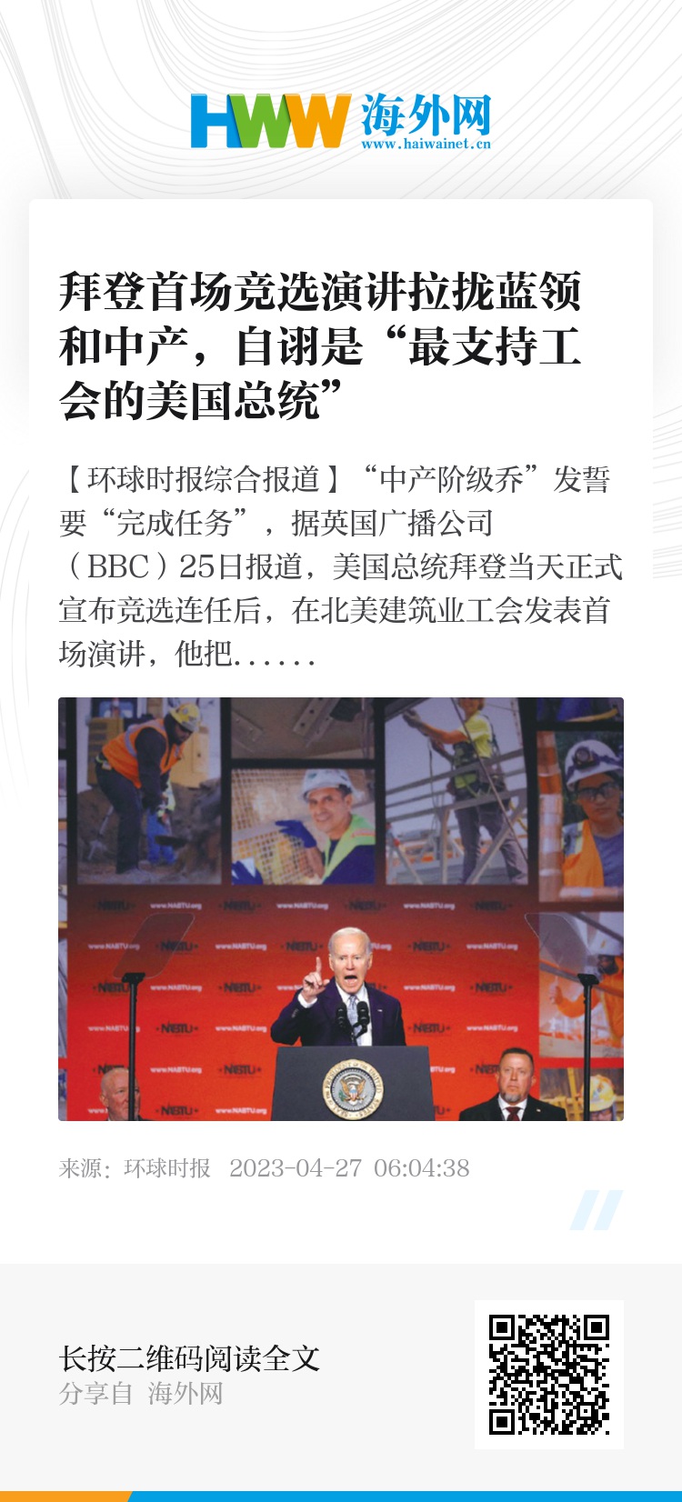 【环球时报综合报道】“中产阶级乔”发誓要“完成任务”,据英国广播公司(BBC)25日报道,美国总统拜登当天正式宣布竞选连任后,在北美建筑业工会发表首场演讲,他把重点放在吸引蓝领及中产选民上,强调未来会持续增加基建投资及重建中产阶级。
