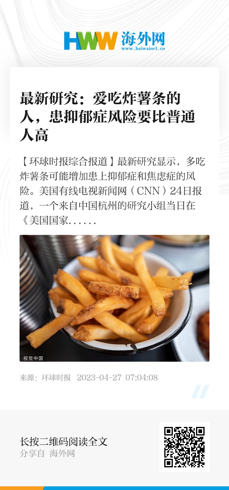 美国有线电视新闻网(CNN)24日报道,一个来自中国杭州的研究小组当日在《美国国家科学院院刊》上发表的研究显示,通过对14万参与者长达10年的跟踪调查,他们发现经常吃油炸食品,尤其是爱吃炸薯条的人,患抑郁症的风险要比普通人高出12%,患焦虑症的风险则高出7%。