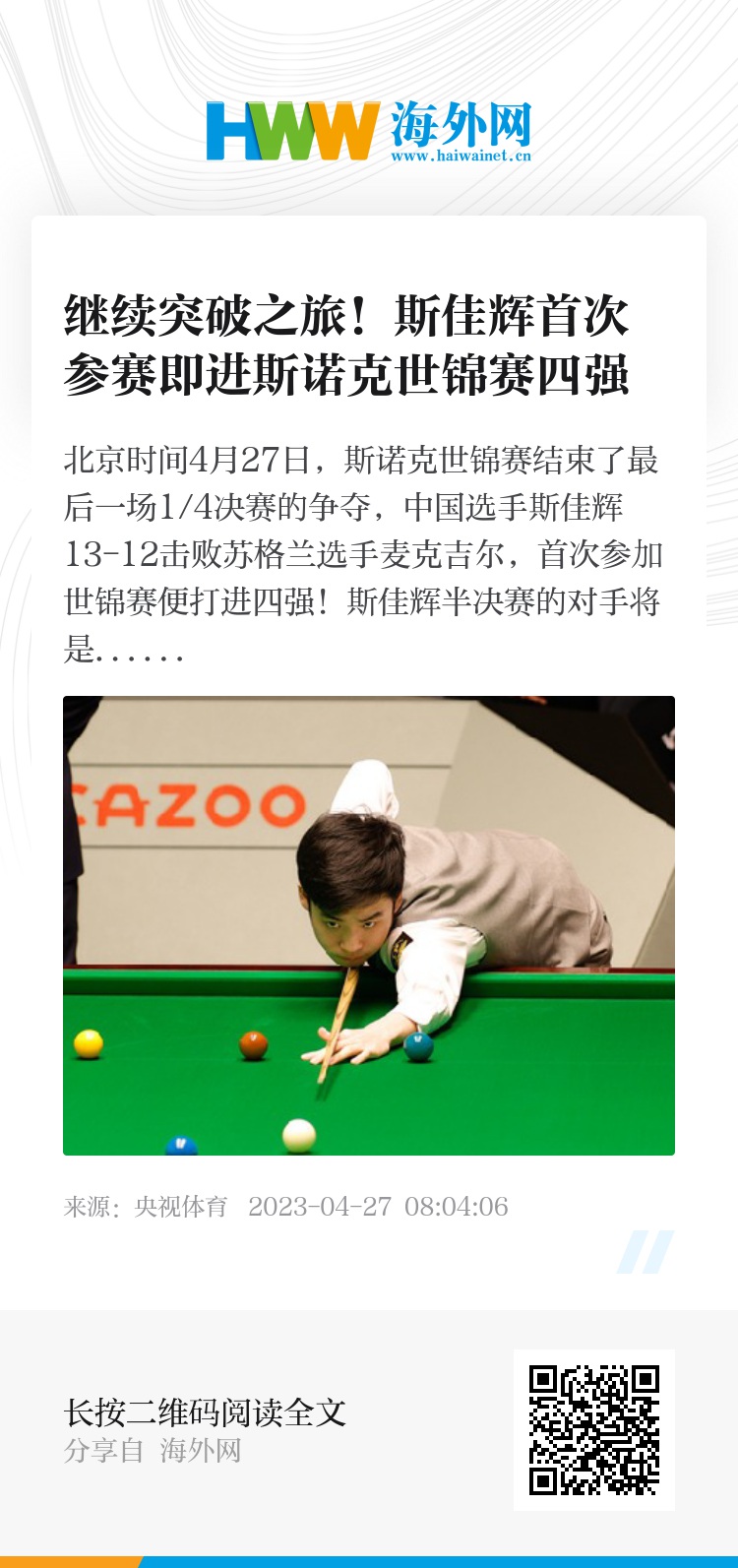 北京时间4月27日,斯诺克世锦赛结束了最后一场1/4决赛的争夺,中国选手斯佳辉13-12击败苏格兰选手麦克吉尔,首次参加世锦赛便打进四强!斯佳辉半决赛的对手将是淘汰了“火箭”奥沙利文的比利时选手布雷切尔。