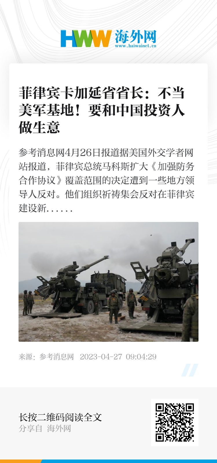 参考消息网4月26日报道据美国外交学者网站报道,菲律宾总统马科斯扩大《加强防务合作协议》覆盖范围的决定遭到一些地方领导人反对。他们组织祈祷集会反对在菲律宾建设新的美国军事设施。