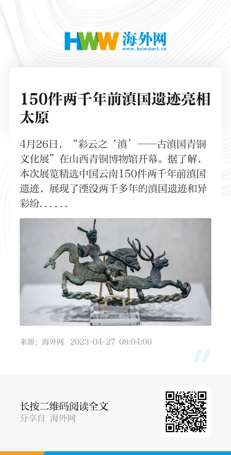 4月26日,“彩云之‘滇’——古滇国青铜文化展”在山西青铜博物馆开幕。据了解,本次展览精选中国云南150件两千年前滇国遗迹,展现了湮没两千多年的滇国遗迹和异彩纷呈的青铜文化。图片来源:胡远嘉/视觉中国