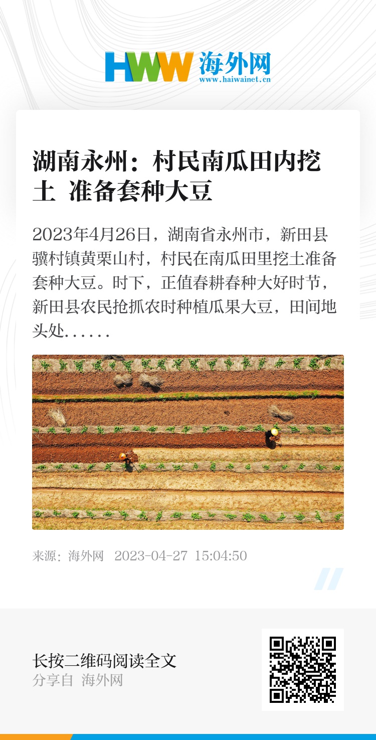 2023年4月26日,湖南省永州市,新田县骥村镇黄栗山村,村民在南瓜田里挖土准备套种大豆。时下,正值春耕春种大好时节,新田县农民抢抓农时种植瓜果大豆,田间地头处处一片繁忙景象。图源:视觉中国