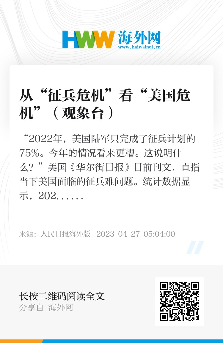 公共健康问题、经济民生困境、政治撕裂、治理失序、穷兵黩武……“征兵危机”折射出一系列“美国危机”。正如一位美国高官所说:“这不是军队的问题,而是整个美国的问题。”(李嘉宝)