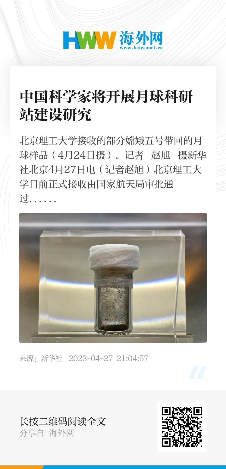 新华社北京4月27日电(记者赵旭)北京理工大学日前正式接收由国家航天局审批通过的500毫克月球样品,本次样品由嫦娥五号带回,将用于面向月球科研站建设的月壤材料特性分析与增材制造关键技术研究。