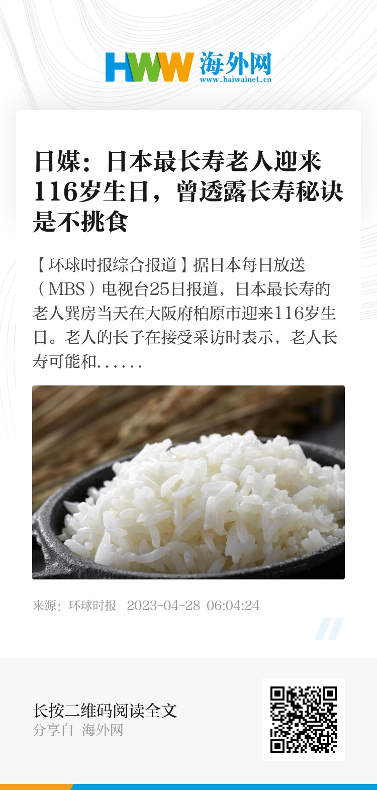 【环球时报综合报道】据日本每日放送(MBS)电视台25日报道,日本最长寿的老人巽房当天在大阪府柏原市迎来116岁生日。老人的长子在接受采访时表示,老人长寿可能和她严谨的生活作息有关,多年来她的生活十分自律,始终坚持按时吃饭、睡觉。
