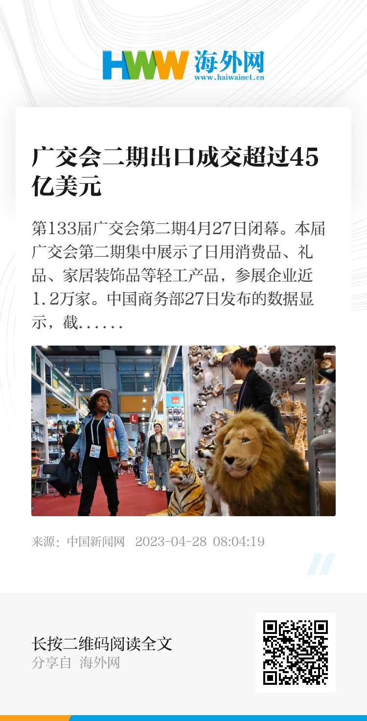 32597371,.广交会二期出口成交超过45亿美元,.2023-04-28 08:50:19,.204372,.刘素素
