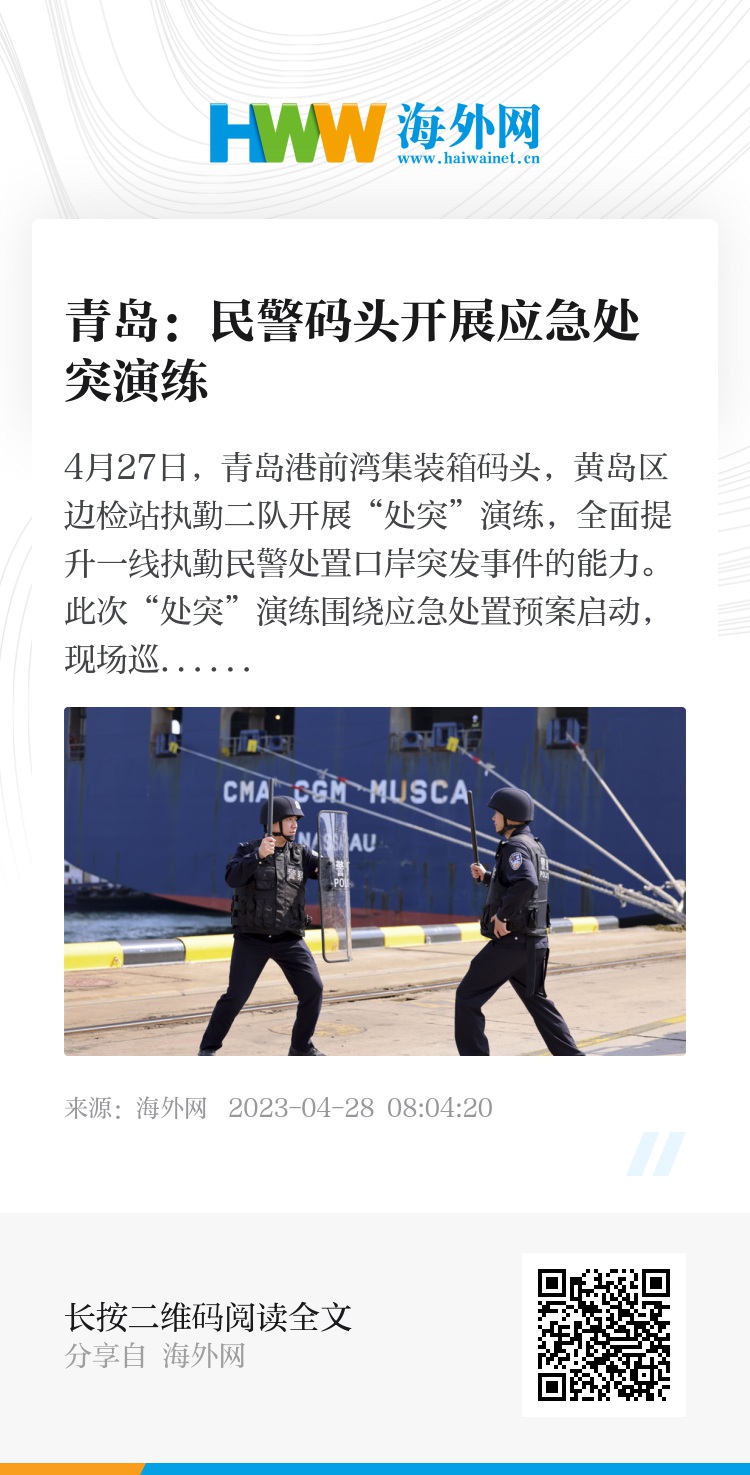 4月27日,青岛港前湾集装箱码头,黄岛区边检站执勤二队开展“处突”演练,全面提升一线执勤民警处置口岸突发事件的能力。此次“处突”演练围绕应急处置预案启动,现场巡查,擒拿格斗,包围擒获“暴恐分子”等内容展开,参加演练的民警携带器械装具在战斗岗位上一丝不苟,整个过程反应敏捷、控制有力,处置突发事件快速有效、依法得当,达到了演练的预期目标。图片来源:视觉中国