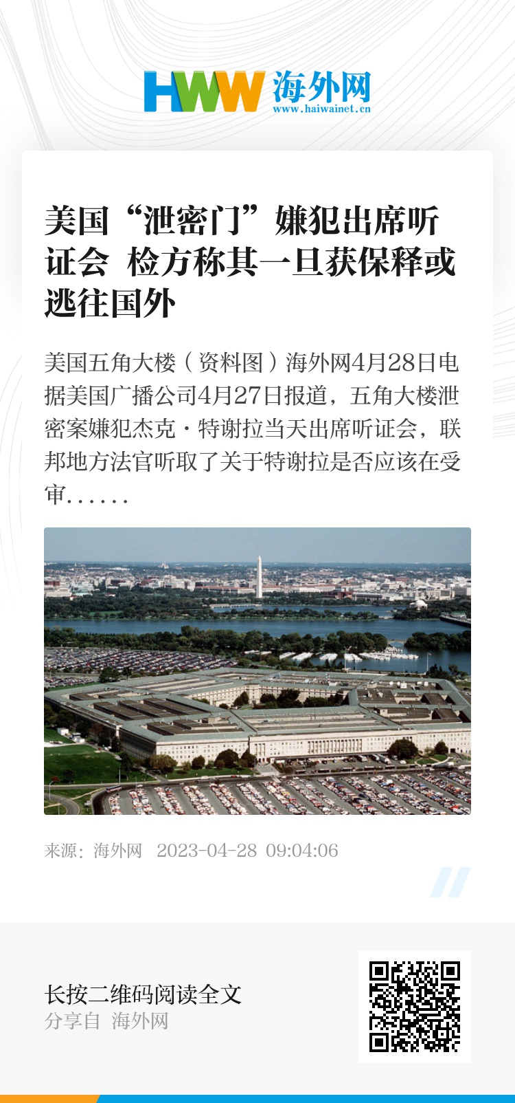 海外网4月28日电 据美国广播公司4月27日报道,五角大楼泄密案嫌犯杰克·特谢拉当天出席听证会,联邦地方法官听取了关于特谢拉是否应该在受审前被拘留的辩论。检方称,一旦保释,特谢拉可能会有“逃跑的风险”,特谢拉的律师则予以反驳。