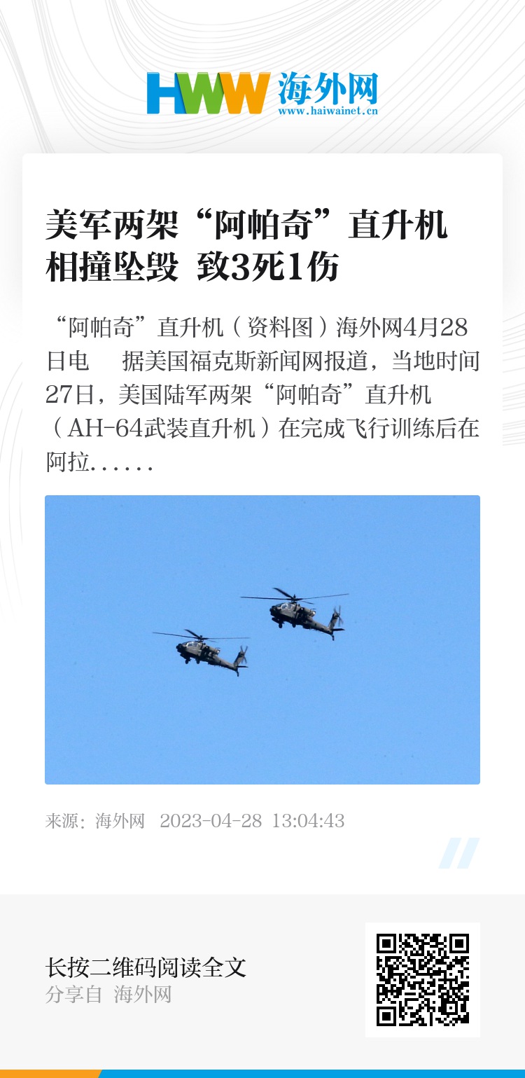 海外网4月28日电 据美国福克斯新闻网报道,当地时间27日,美国陆军两架“阿帕奇”直升机(AH-64武装直升机)在完成飞行训练后在阿拉斯加相撞,造成3名士兵死亡,另有1人受伤。