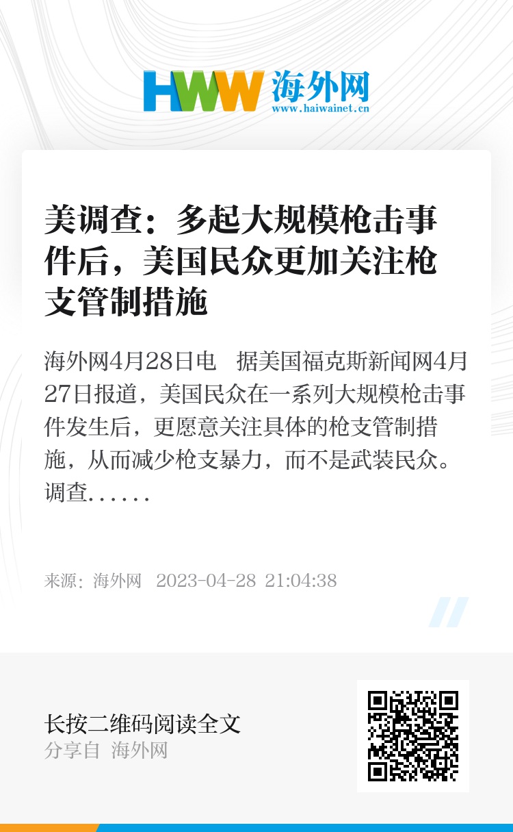 海外网4月28日电 据美国福克斯新闻网4月27日报道,美国民众在一系列大规模枪击事件发生后,更愿意关注具体的枪支管制措施,从而减少枪支暴力,而不是武装民众。