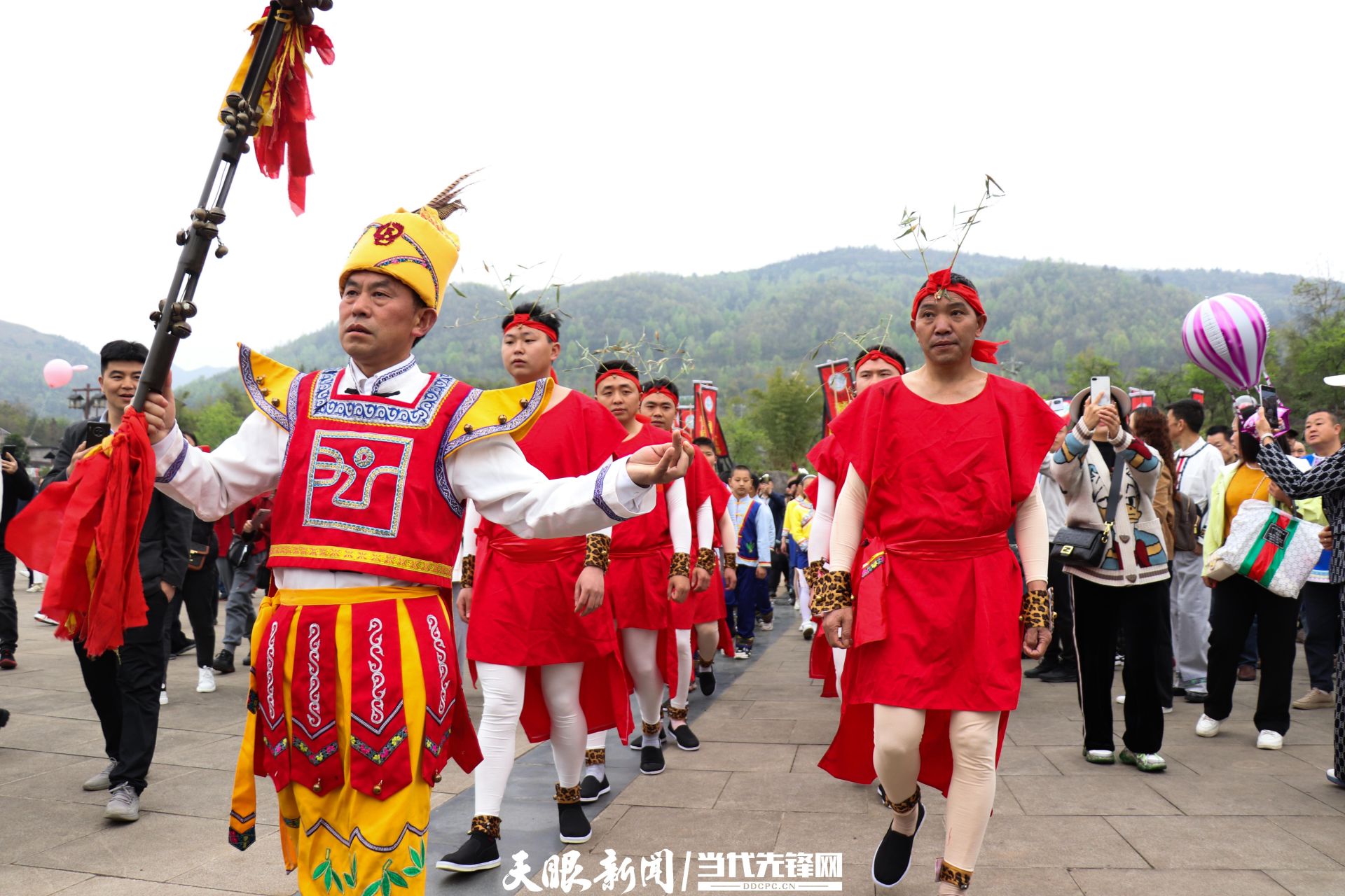 乐曲声中,参祭人员用歌声敬祭仡佬族祖先,戴着傩戏面具,为来宾及仡佬族族裔们献上优美的仡佬民族舞蹈,参加活动的人们在祭祀仪式结束后到结福柱前,将丝带打成一个个结,为后世子孙祈福、将祝福传到九天。