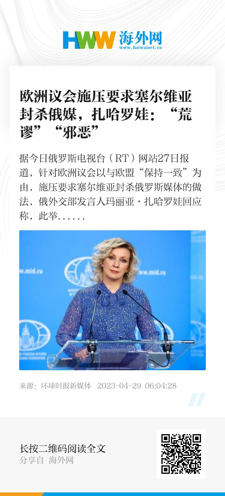 据今日俄罗斯电视台(RT)网站27日报道,针对欧洲议会以与欧盟“保持一致”为由,施压要求塞尔维亚封杀俄罗斯媒体的做法,俄外交部发言人玛丽亚·扎哈罗娃回应称,此举不但“荒谬”“邪恶”,而且是一种帝国主义和殖民主义的体现。