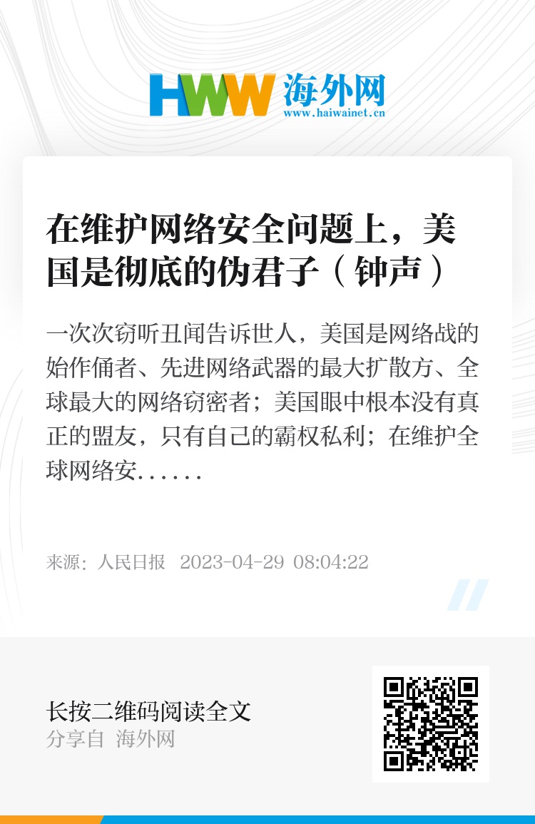 近期,一批美军秘密文件出现在社交媒体上,暴露了美国对联合国秘书长以及对韩国、以色列、乌克兰等国家的窃听行径。此次泄密事件再次印证,美国是世界上最大的“黑客帝国”,一直在无孔不入、无处不在地监听世界各国人民,美方所谓“清洁网络”和“符合民主价值观和利益的技术”的说法极其虚伪。