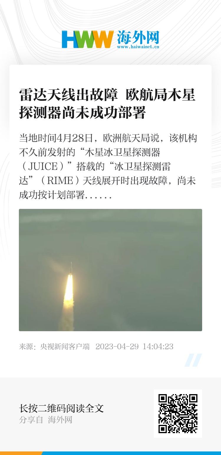 当地时间4月28日,欧洲航天局说,该机构不久前发射的“木星冰卫星探测器(JUICE)”搭载的“冰卫星探测雷达”(RIME)天线展开时出现故障,尚未成功按计划部署。