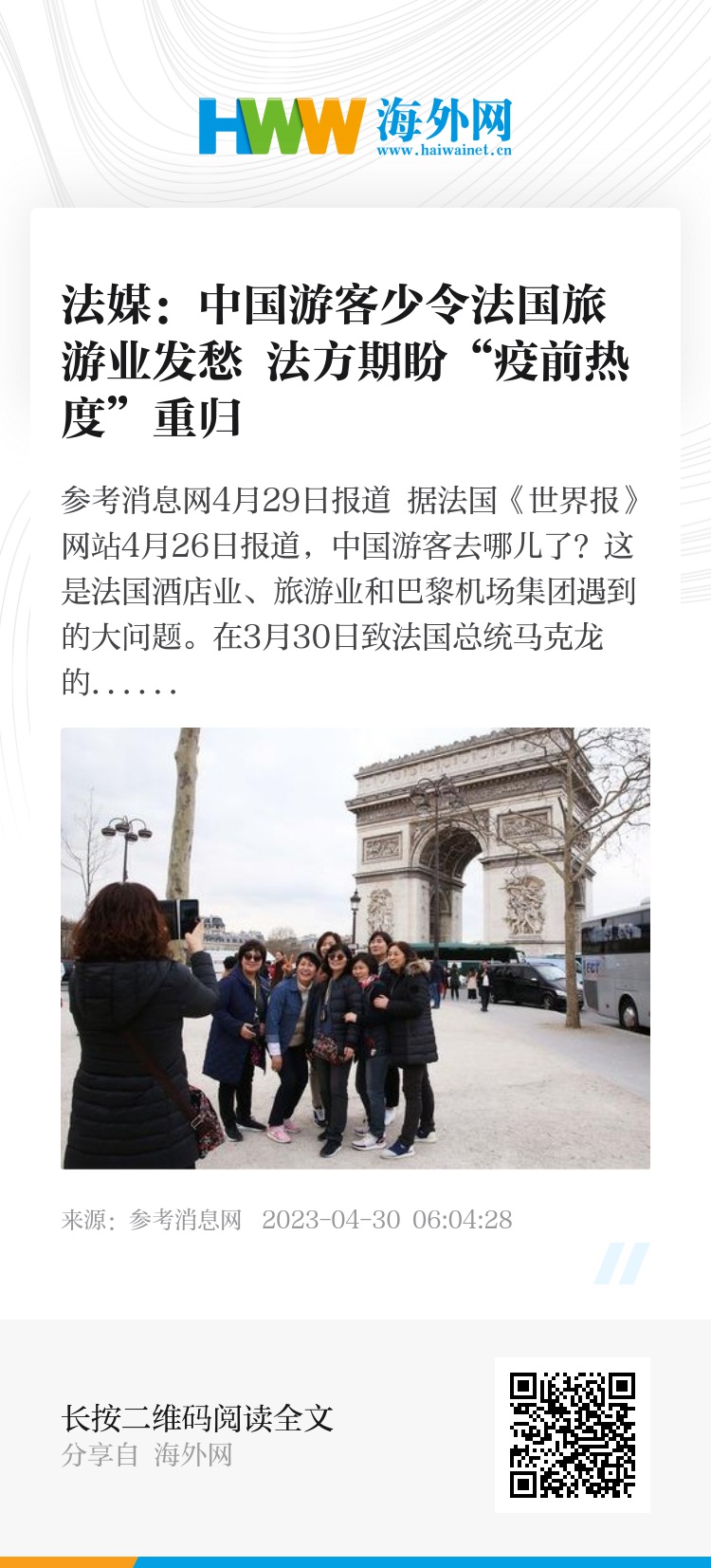 参考消息网4月29日报道 据法国《世界报》网站4月26日报道,中国游客去哪儿了?这是法国酒店业、旅游业和巴黎机场集团遇到的大问题。在3月30日致法国总统马克龙的一封信中,巴黎机场集团总裁奥古斯丁·德罗马内、雅高集团总裁塞巴斯蒂安·巴赞、老佛爷百货总经理尼古拉·乌泽和地中海俱乐部总裁亨利·吉斯卡尔·德斯坦对中国游客的长期缺席表达了担忧。