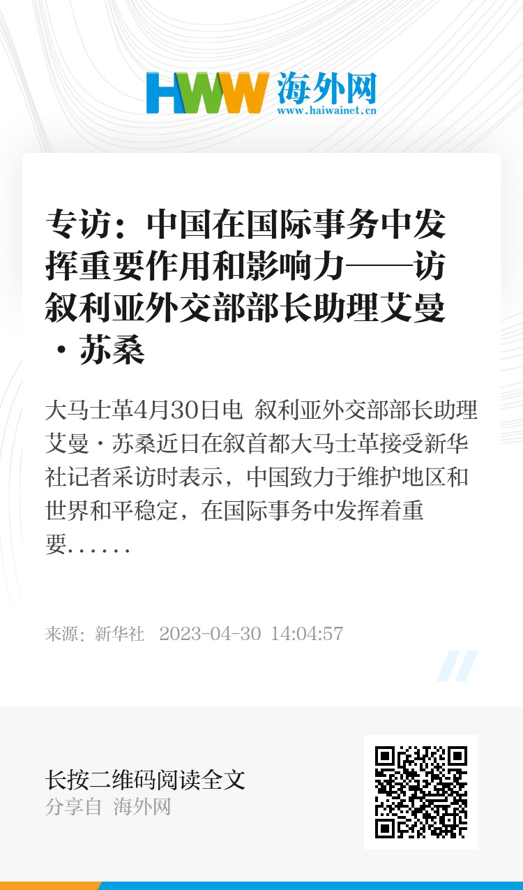 新华社大马士革4月30日电 叙利亚外交部部长助理艾曼·苏桑近日在叙首都大马士革接受新华社记者采访时表示,中国致力于维护地区和世界和平稳定,在国际事务中发挥着重要作用和影响力。