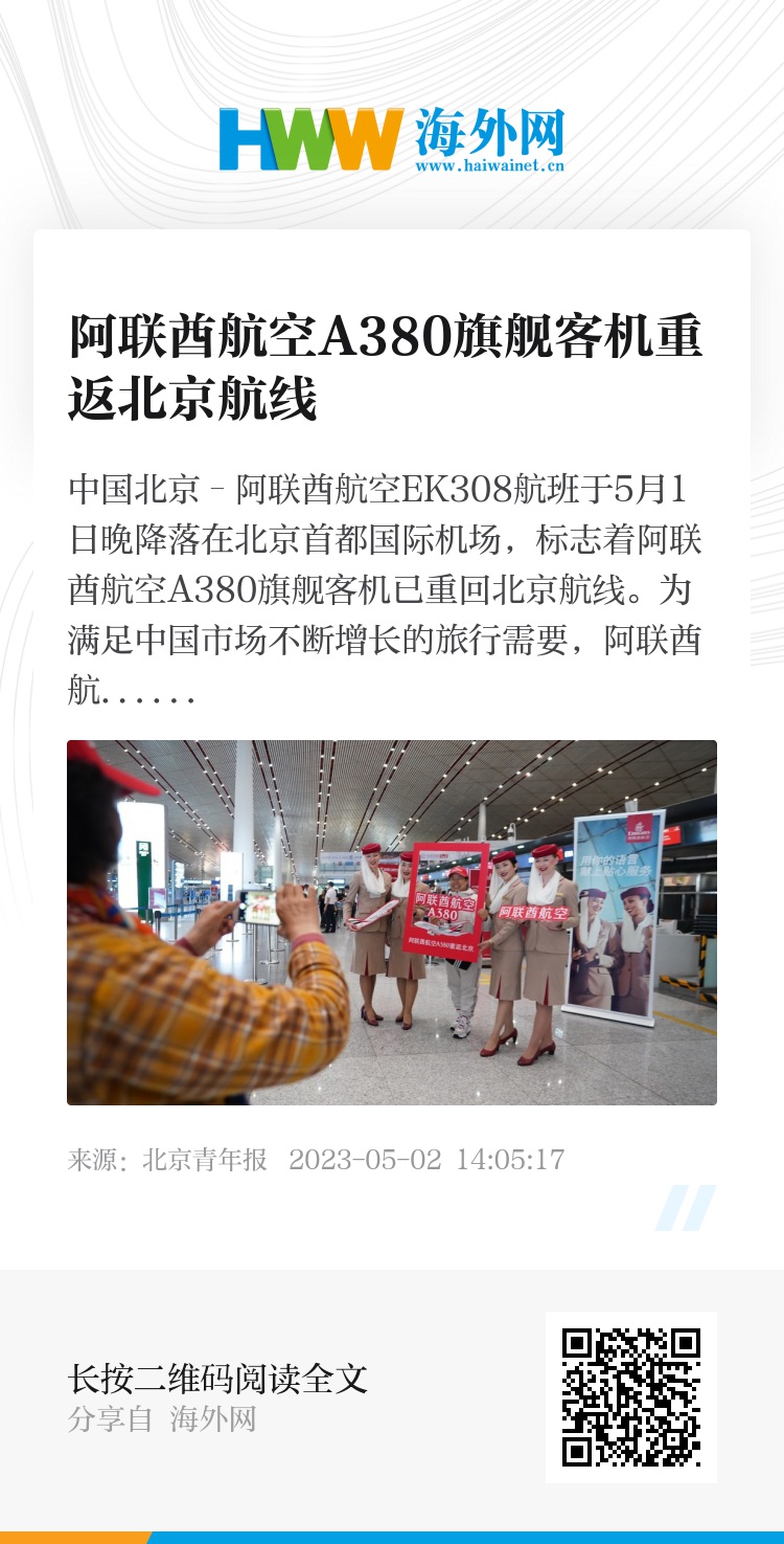 中国北京–阿联酋航空EK308航班于5月1日晚降落在北京首都国际机场,标志着阿联酋航空A380旗舰客机已重回北京航线。为满足中国市场不断增长的旅行需要,阿联酋航空计划自9月1日起,在迪拜往返北京每日一班的基础上,再增加每日一班,且全部采用A380客机执飞。届时,阿联酋航空在中国内地市场运营的航班数将达到每周35个,包括:迪拜-北京每日两班(全部由A380客机执飞)、迪拜-上海每日两班(分别由A380和波音777-300ER客机执飞),迪拜-广州每日一班(由A380客机执飞)。图片来源:北京青年报记者 崔峻/视觉中国