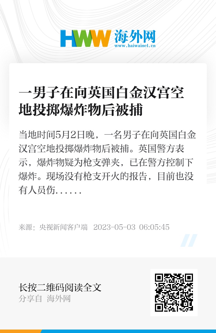 当地时间5月2日晚,一名男子在向英国白金汉宫空地投掷爆炸物后被捕。