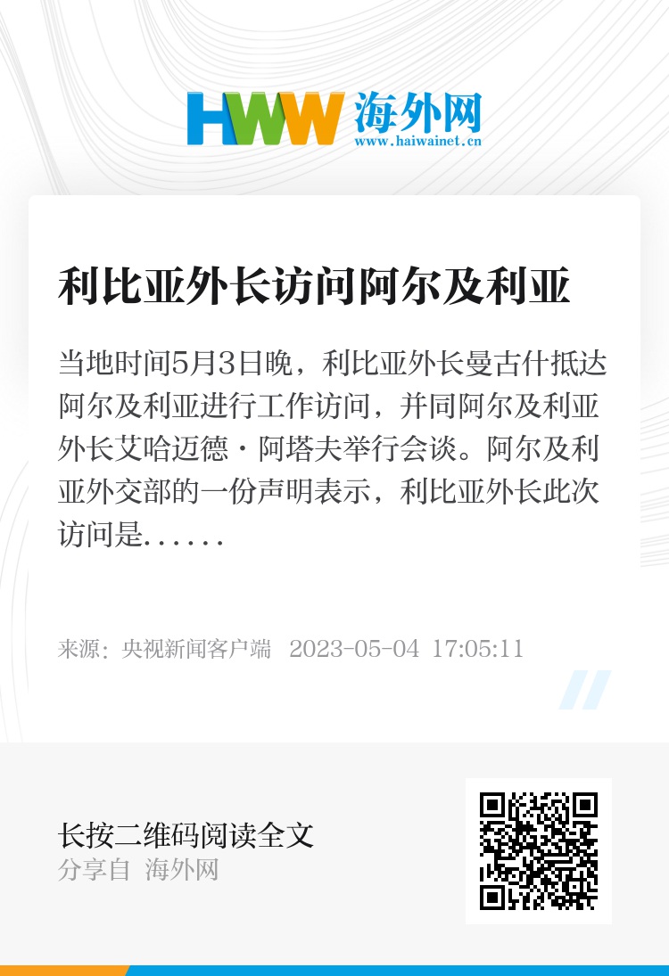 阿尔及利亚外交部的一份声明表示,利比亚外长此次访问是为了加强利比亚同阿尔及利亚的双边合作关系,以及促进两国在共同关心的问题上保持沟通与协调。(总台记者 孙建)