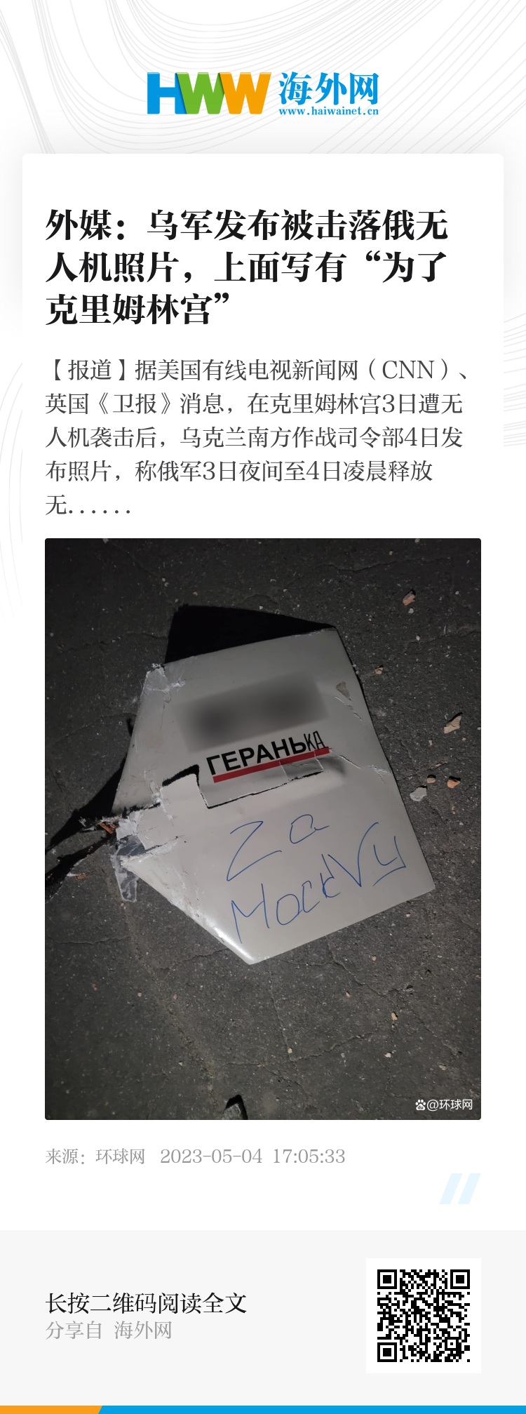 【环球网报道】据美国有线电视新闻网(CNN)、英国《卫报》消息,在克里姆林宫3日遭无人机袭击后,乌克兰南方作战司令部4日发布照片,称俄军3日夜间至4日凌晨释放无人机袭击敖德萨,其中有被击落的无人机尾翼上写有“为了克里姆林宫”“为了莫斯科”字样。