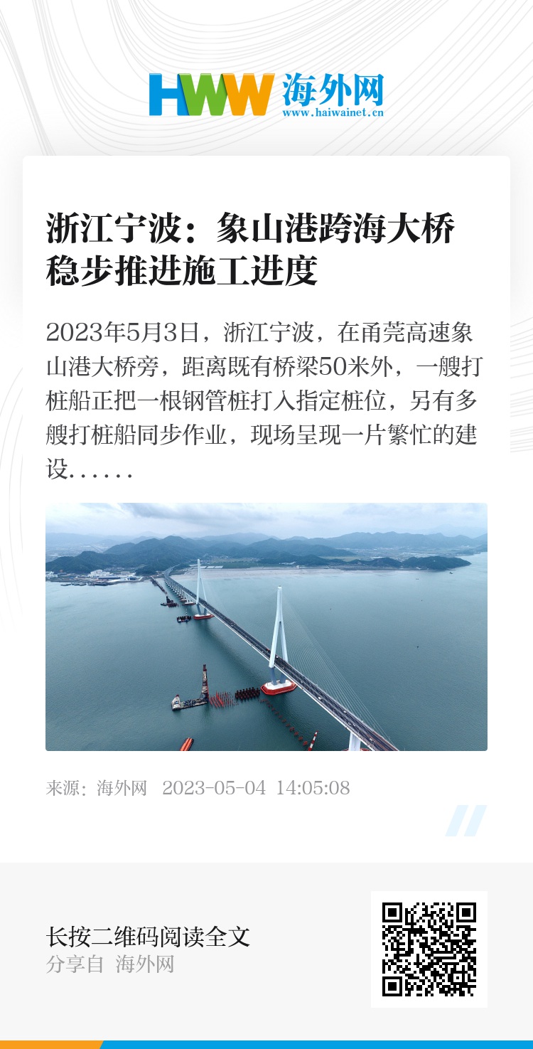 2023年5月3日,浙江宁波,在甬莞高速象山港大桥旁,距离既有桥梁50米外,一艘打桩船正把一根钢管桩打入指定桩位,另有多艘打桩船同步作业,现场呈现一片繁忙的建设景象。据了解,正在建设的是宁波至象山市域(郊)铁路工程象山港跨海大桥项目,全线长约61.45公里,其中象山港铁路跨海大桥全长8.26公里,跨海段桥梁长6.24 公里。五一佳节期间,工人们全力奋战在建桥工地。图源:视觉中国