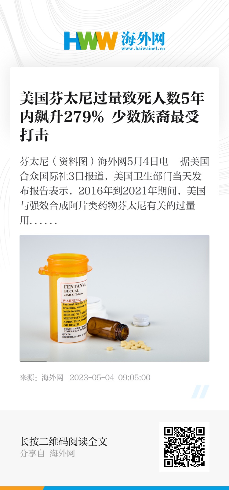 海外网5月4日电 据美国合众国际社3日报道,美国卫生部门当天发布报告表示,2016年到2021年期间,美国与强效合成阿片类药物芬太尼有关的过量用药死亡人数飙升279%,其中少数族裔受到的打击最为严重。