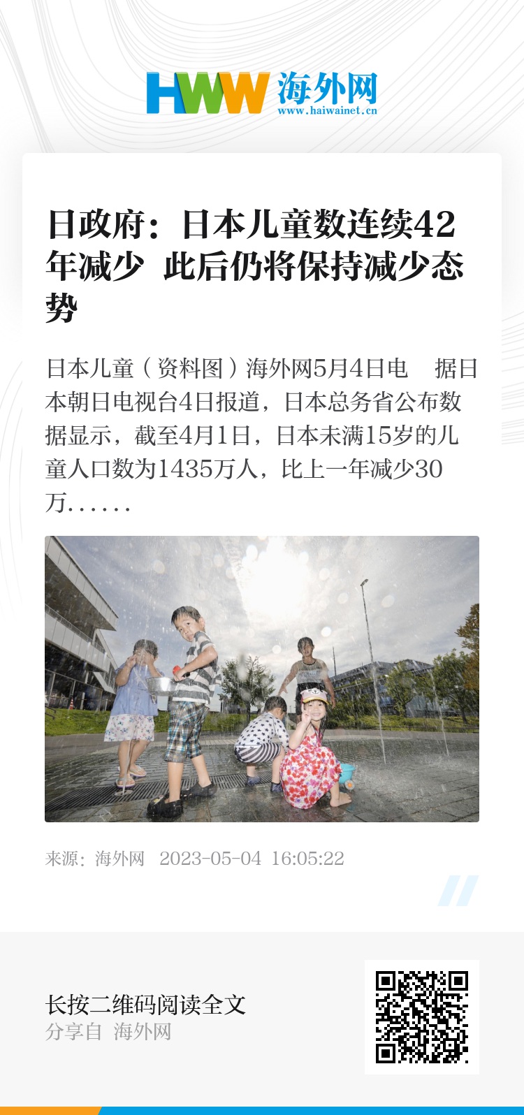 海外网5月4日电 据日本朝日电视台4日报道,日本总务省公布数据显示,截至4月1日,日本未满15岁的儿童人口数为1435万人,比上一年减少30万人,连续42年减少。