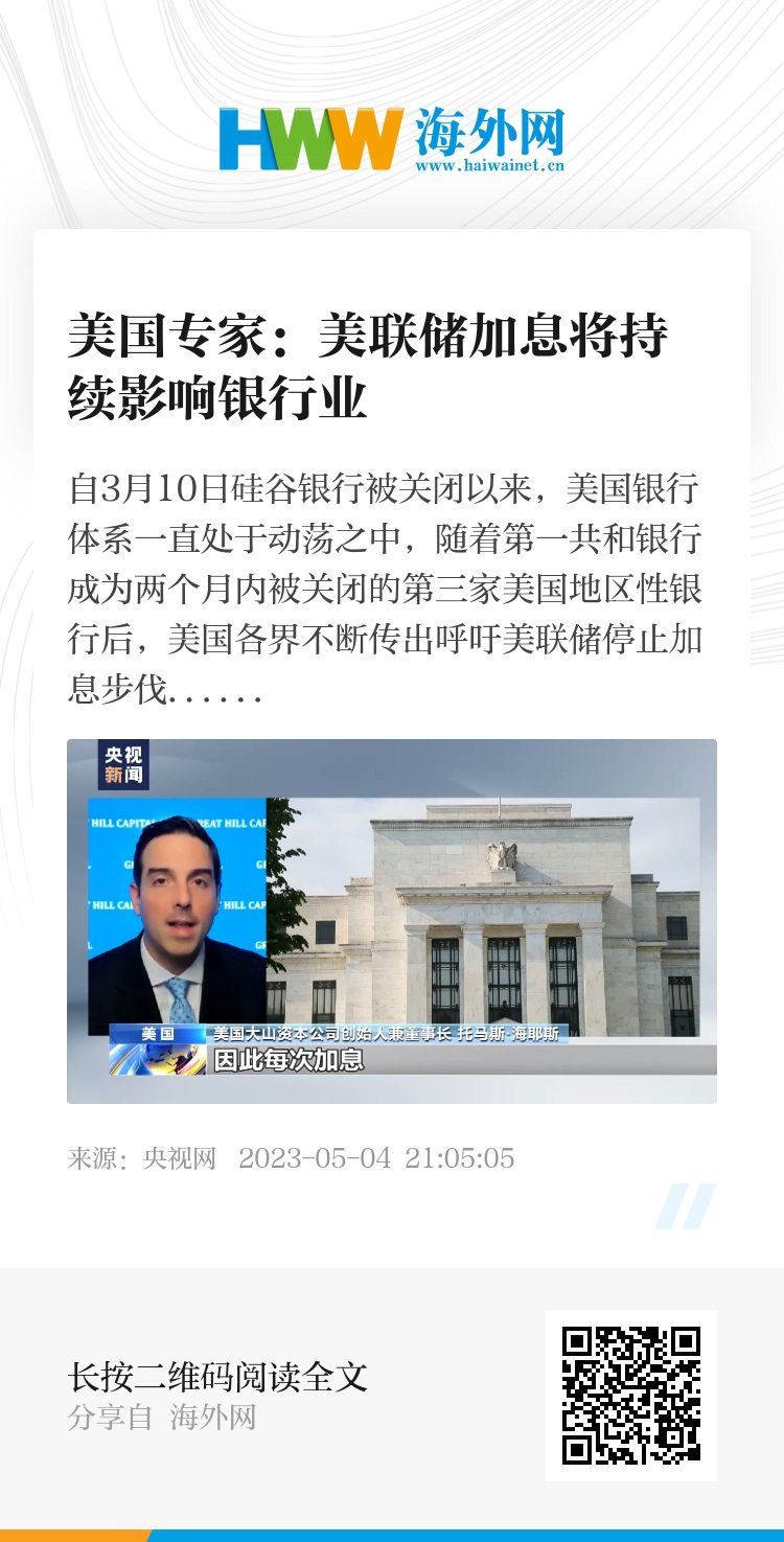 自3月10日硅谷银行被关闭以来,美国银行体系一直处于动荡之中,随着第一共和银行成为两个月内被关闭的第三家美国地区性银行后,美国各界不断传出呼吁美联储停止加息步伐的声音。对于美联储宣布再次加息,美国业内人士表示,美联储这种行为将给本就处在动荡之中的银行业带来持续影响。