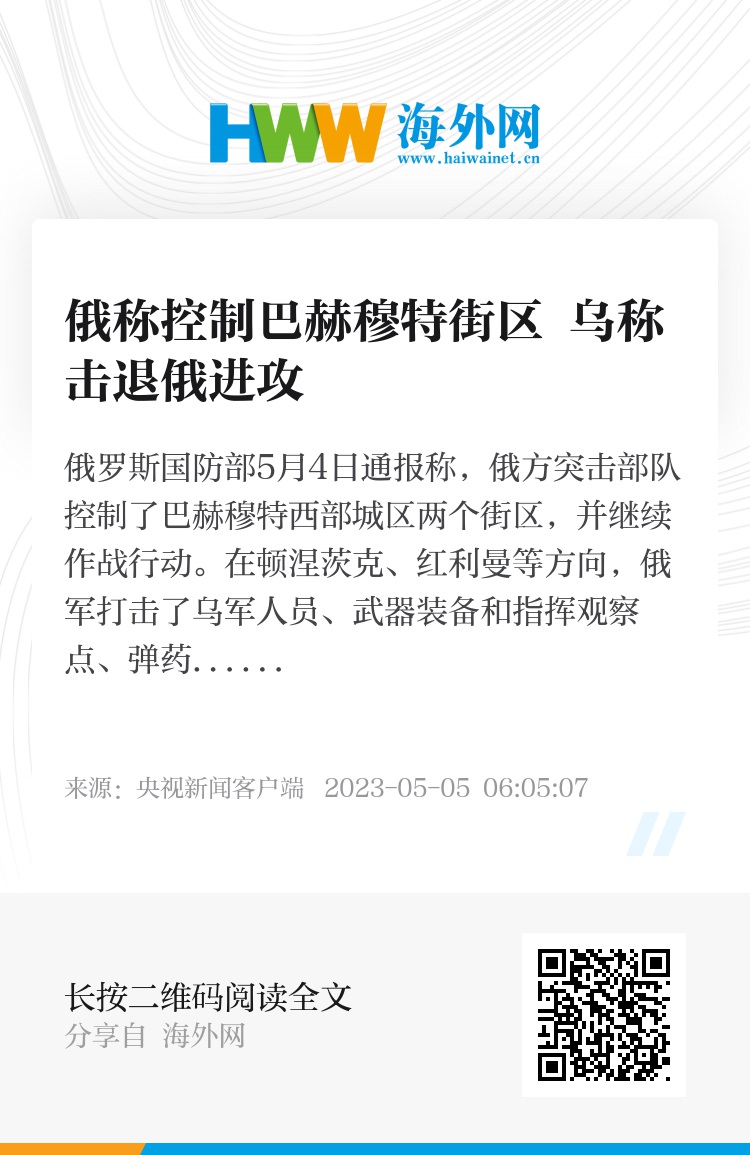 俄罗斯国防部5月4日通报称,俄方突击部队控制了巴赫穆特西部城区两个街区,并继续作战行动。在顿涅茨克、红利曼等方向,俄军打击了乌军人员、武器装备和指挥观察点、弹药库、油料库等目标。俄军防空系统拦截了多枚火箭弹,击落多架无人机。
