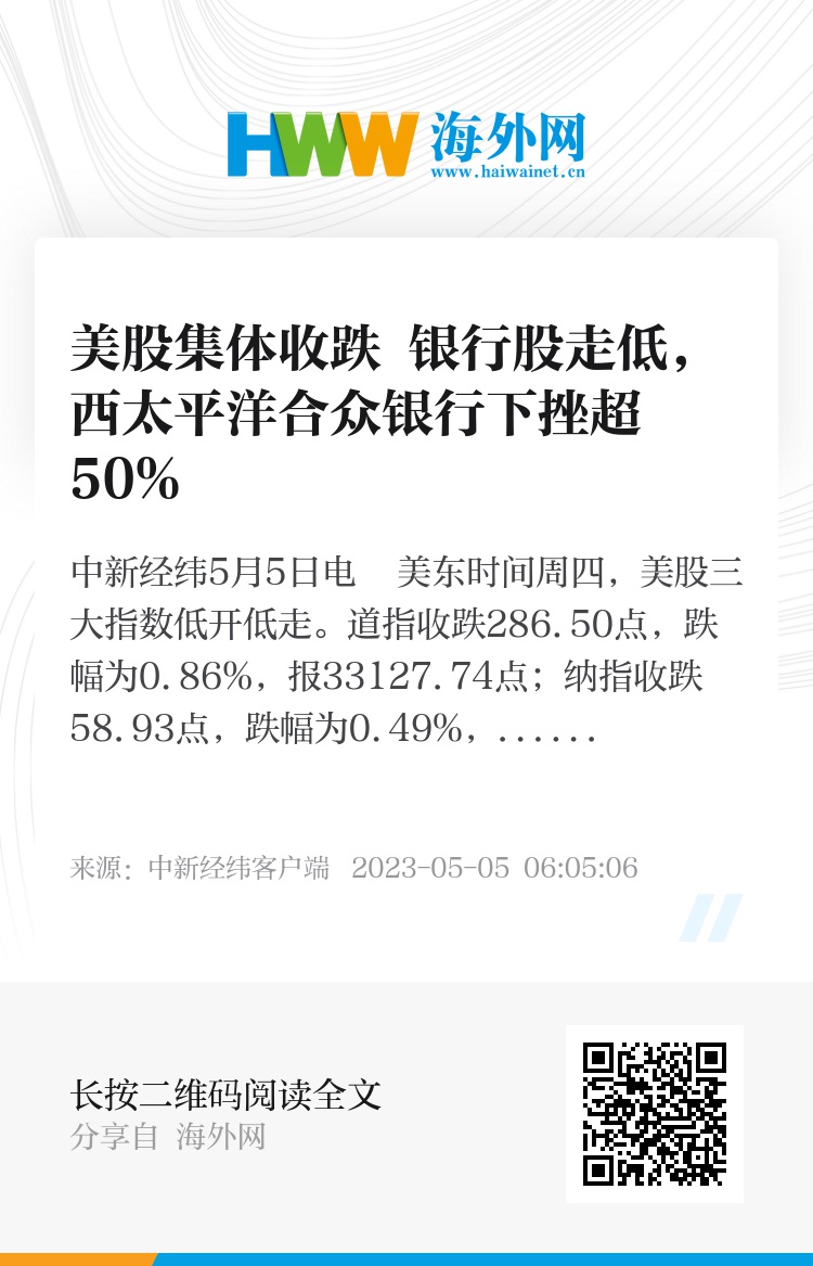 中新经纬5月5日电 美东时间周四,美股三大指数低开低走。道指收跌286.50点,跌幅为0.86%,报33127.74点;纳指收跌58.93点,跌幅为0.49%,报11966.40点;标普500指数收跌29.53点,跌幅为0.72%,报4061.22点。