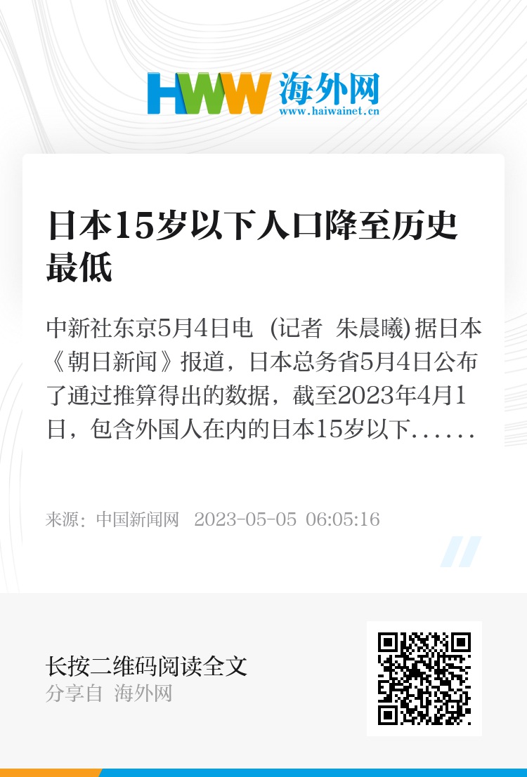 中新社东京5月4日电 (记者 朱晨曦)据日本《朝日新闻》报道,日本总务省5月4日公布了通过推算得出的数据,截至2023年4月1日,包含外国人在内的日本15岁以下人口降至1435万人,为历史最低水平。