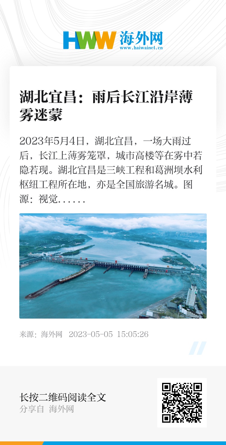 2023年5月4日,湖北宜昌,一场大雨过后,长江上薄雾笼罩,城市高楼等在雾中若隐若现。湖北宜昌是三峡工程和