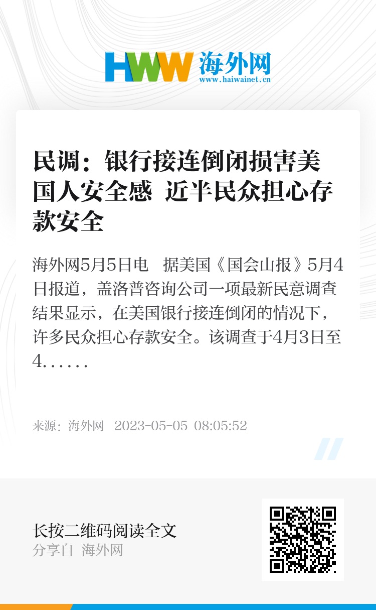 海外网5月5日电 据美国《国会山报》5月4日报道,盖洛普咨询公司一项最新民意调查结果显示,在美国银行接连倒闭的情况下,许多民众担心存款安全。