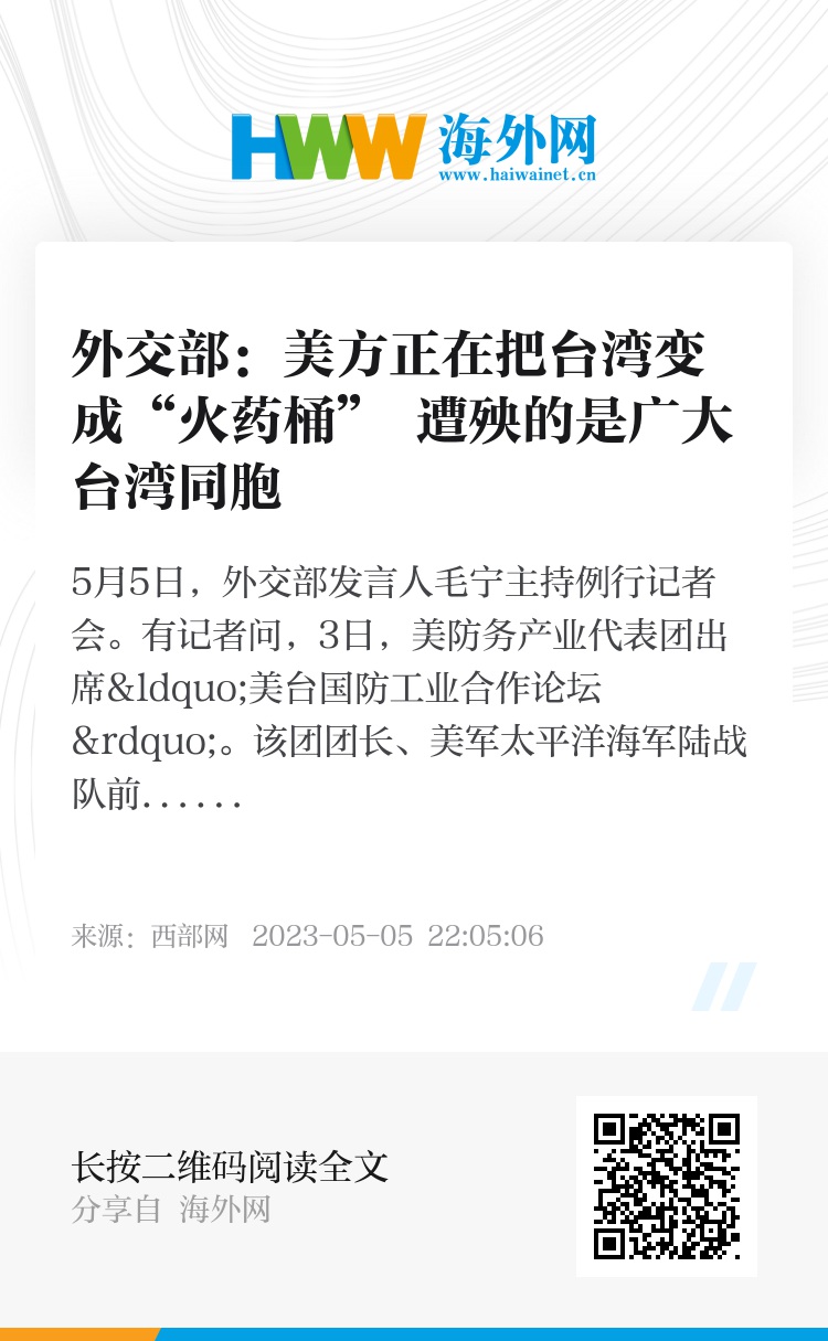 对此,毛宁表示,美方对台售武严重违反一个中国原则和中美三个联合公报,特别是“八一七”公报的规定,中方一贯坚决反对。近期美台不断加大军事勾连,美国25家军火商组团窜台,与民进党当局举行所谓“防务论坛”,再次表明,美方正在把台湾变成“火药桶”,遭殃的是广大台湾同胞。