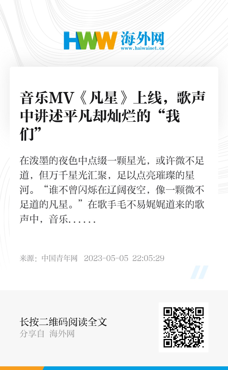 “谁不曾闪烁在辽阔夜空,像一颗微不足道的凡星。”在歌手毛不易娓娓道来的歌声中,音乐MV《凡星》徐徐勾勒着每一个“平凡的人”的模样:他们有着朴素的善良、平淡的勤恳,在平凡的岁月书册里一笔笔书写,默不作声追逐着心之所向,也不自知地散发着莹莹的光。
