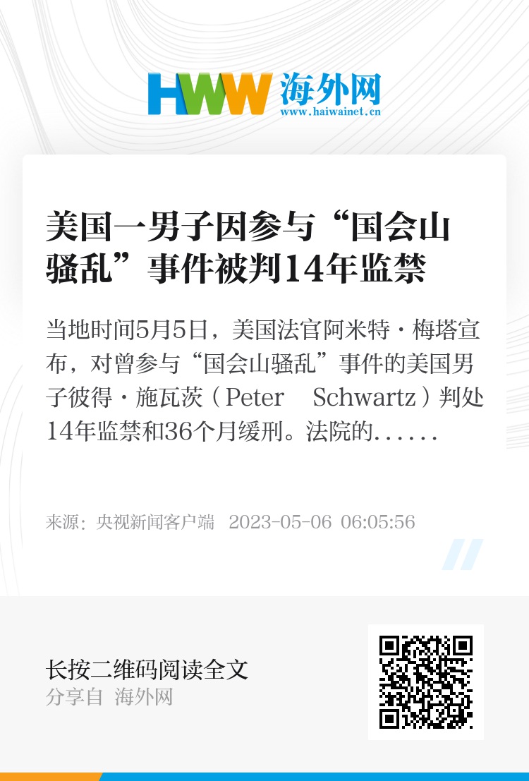 当地时间5月5日,美国法官阿米特·梅塔宣布,对曾参与“国会山骚乱”事件的美国男子彼得·施瓦茨(Peter Schwartz)判处14年监禁和36个月缓刑。