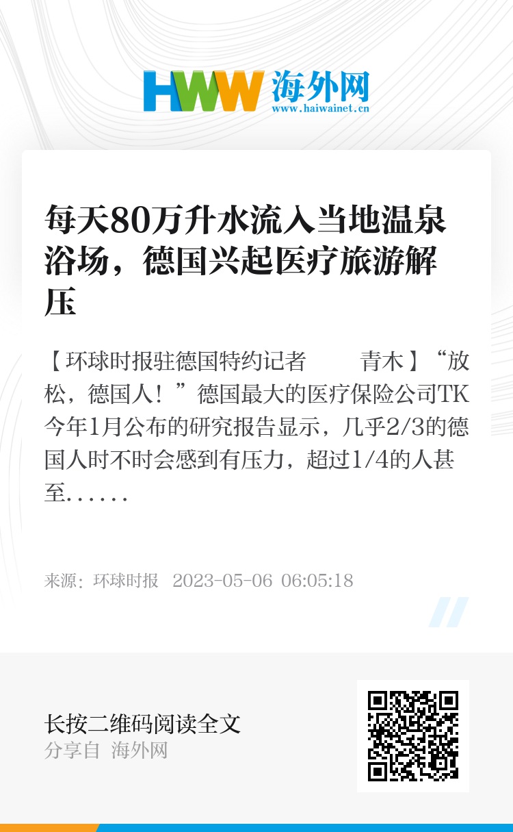 近年来,德国各地还兴起医疗旅游。德国温泉名城巴登-巴登是医疗旅游做得最好的欧洲城市之一。《环球时报》记者最近去当地探访了解到,大约2000年前,巴登-巴登就已经有了温泉浴文化。目前,该地有12个冒泡泉,每天有80万升水流入当地的温泉浴场来发展医疗旅游。