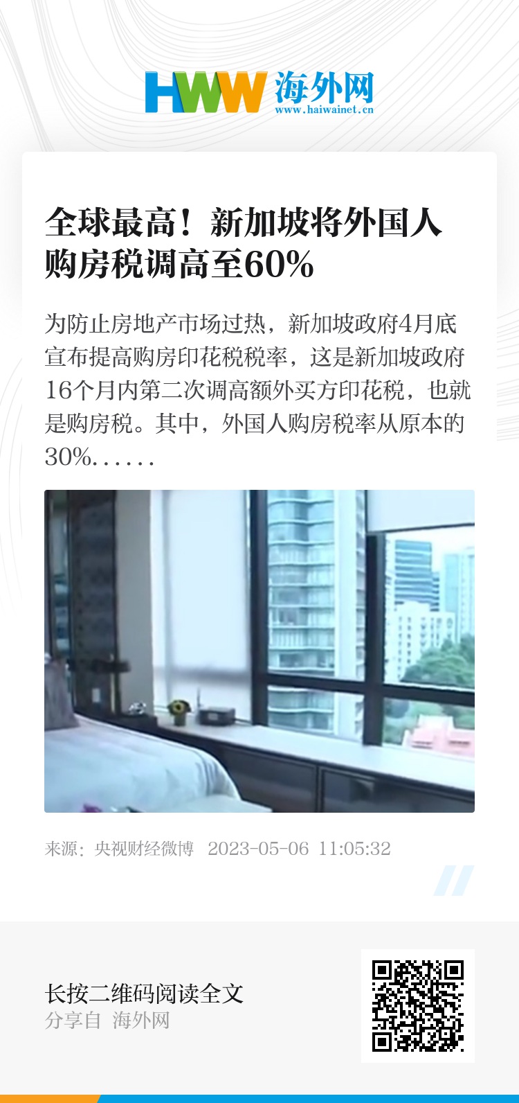 为防止房地产市场过热,新加坡政府4月底宣布提高购房印花税税率,这是新加坡政府16个月内第二次调高额外买方印花税,也就是购房税。其中,外国人购房税率从原本的30%提高到了60%,是向外国人征购房税的全球最高水平。据相关数据,外国买家购买新加坡住宅单位数量近来有上升趋势,今年第一季度外国买家买下了258个单位,环比上升了14.2%,同比上升了77.9%。业内人士表示,房地产市场有所谓的“溢出效应”,是指当某一种类型的房屋价格上涨的时候,会带动所有类型的房屋价格上涨,这也是新加坡政府最担心的地方。
