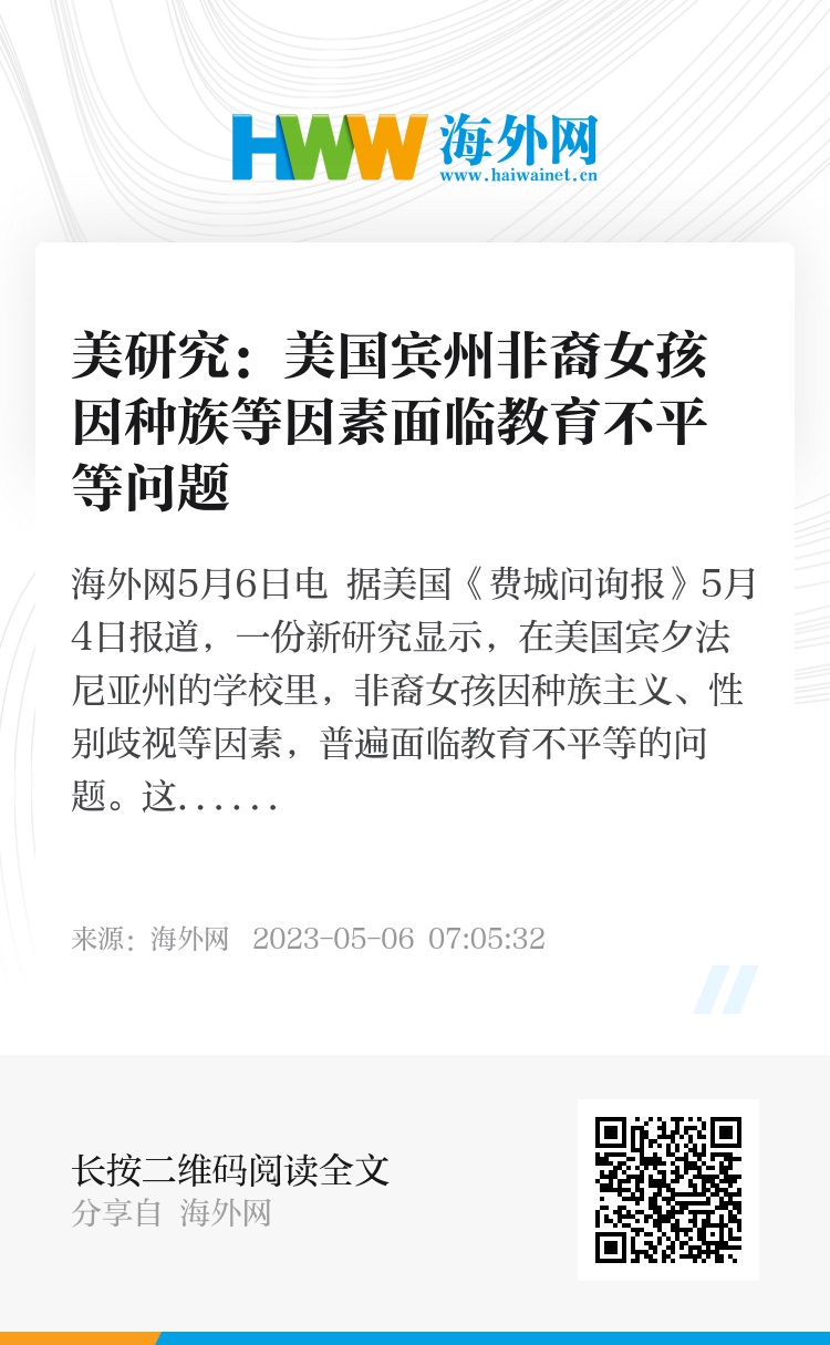 海外网5月6日电 据美国《费城问询报》5月4日报道,一份新研究显示,在美国宾夕法尼亚州的学校里,非裔女孩因种族主义、性别歧视等因素,普遍面临教育不平等的问题。