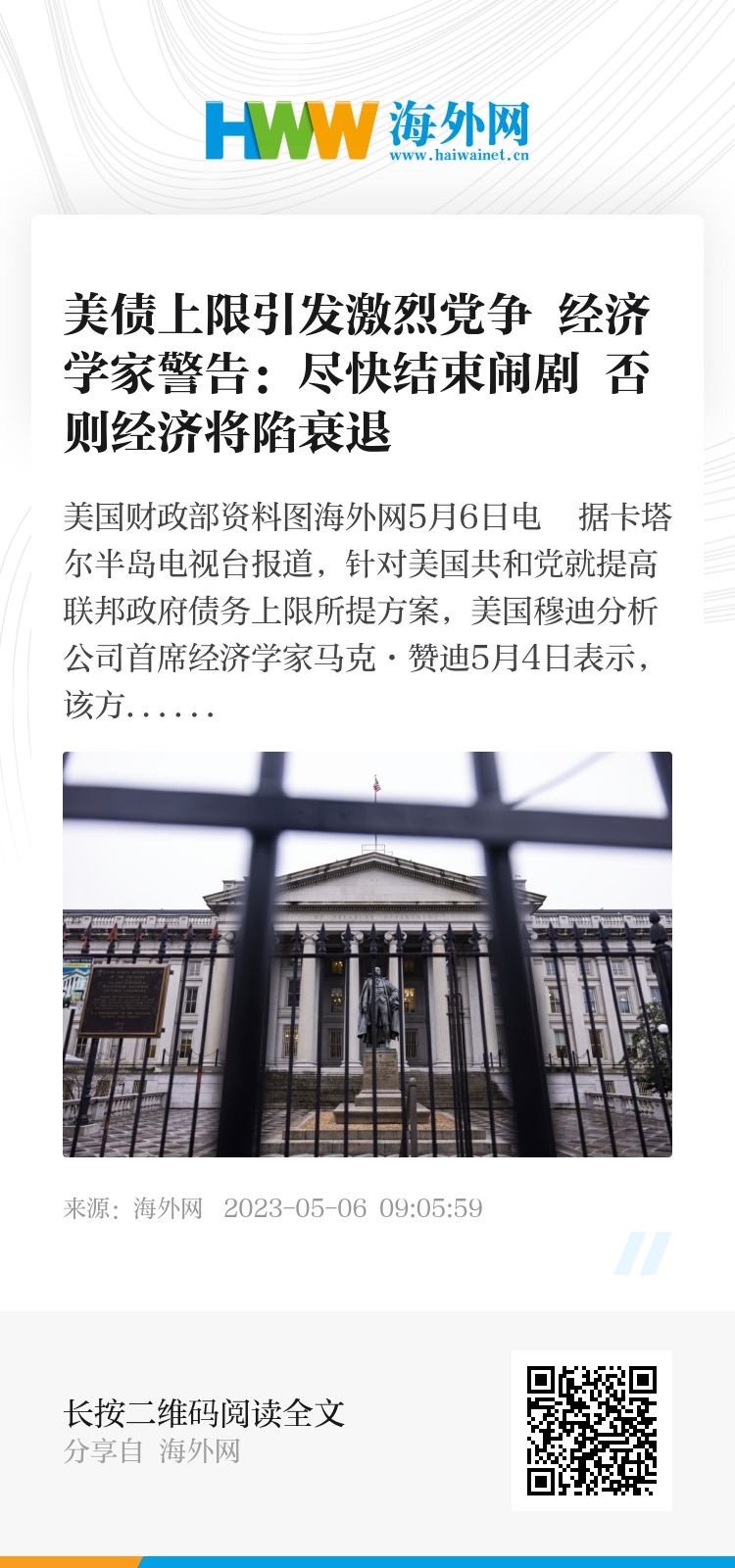 海外网5月6日电 据卡塔尔半岛电视台报道,针对美国共和党就提高联邦政府债务上限所提方案,美国穆迪分析公司首席经济学家马克·赞迪5月4日表示,该方案将拉低就业率、拖累经济增长、显著提高美国经济陷入衰退的可能性。
