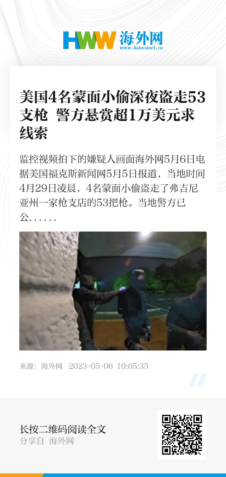 弗吉尼亚州费尔法克斯县警方透露,这起枪支盗窃案发生在4月29日深夜3时到4时之间。监控录像显示,4名嫌疑人通过店门上方的小窗户进入店内,盗走53把枪后驾驶一辆无牌照灰色轿车逃离现场。