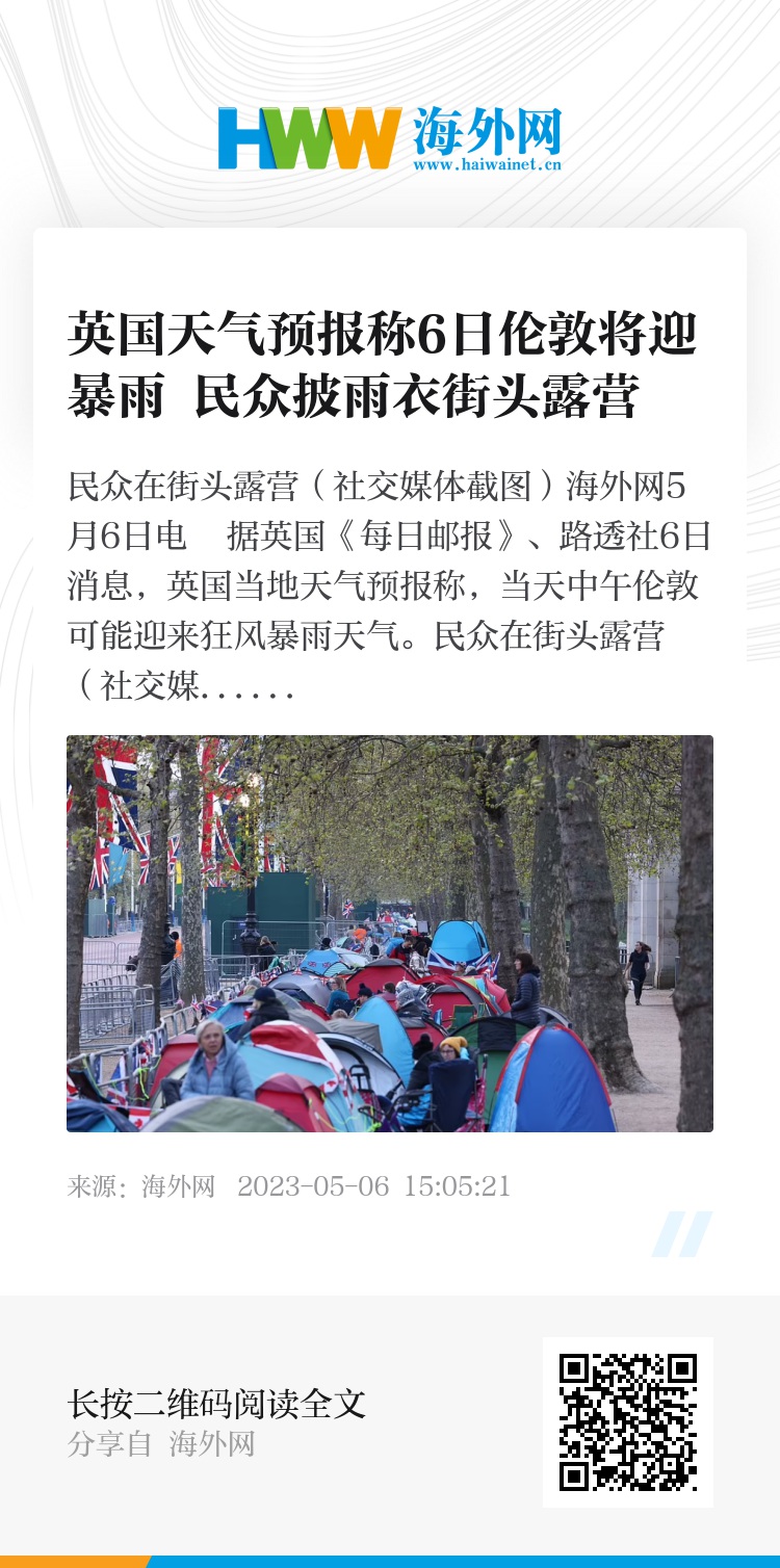 众多英国民众目前已经在白金汉宫外的街头身披雨具露营,抢占最佳位置。6日还将有大批来自世界各国的民众前往伦敦。(海外网 王珊宁)