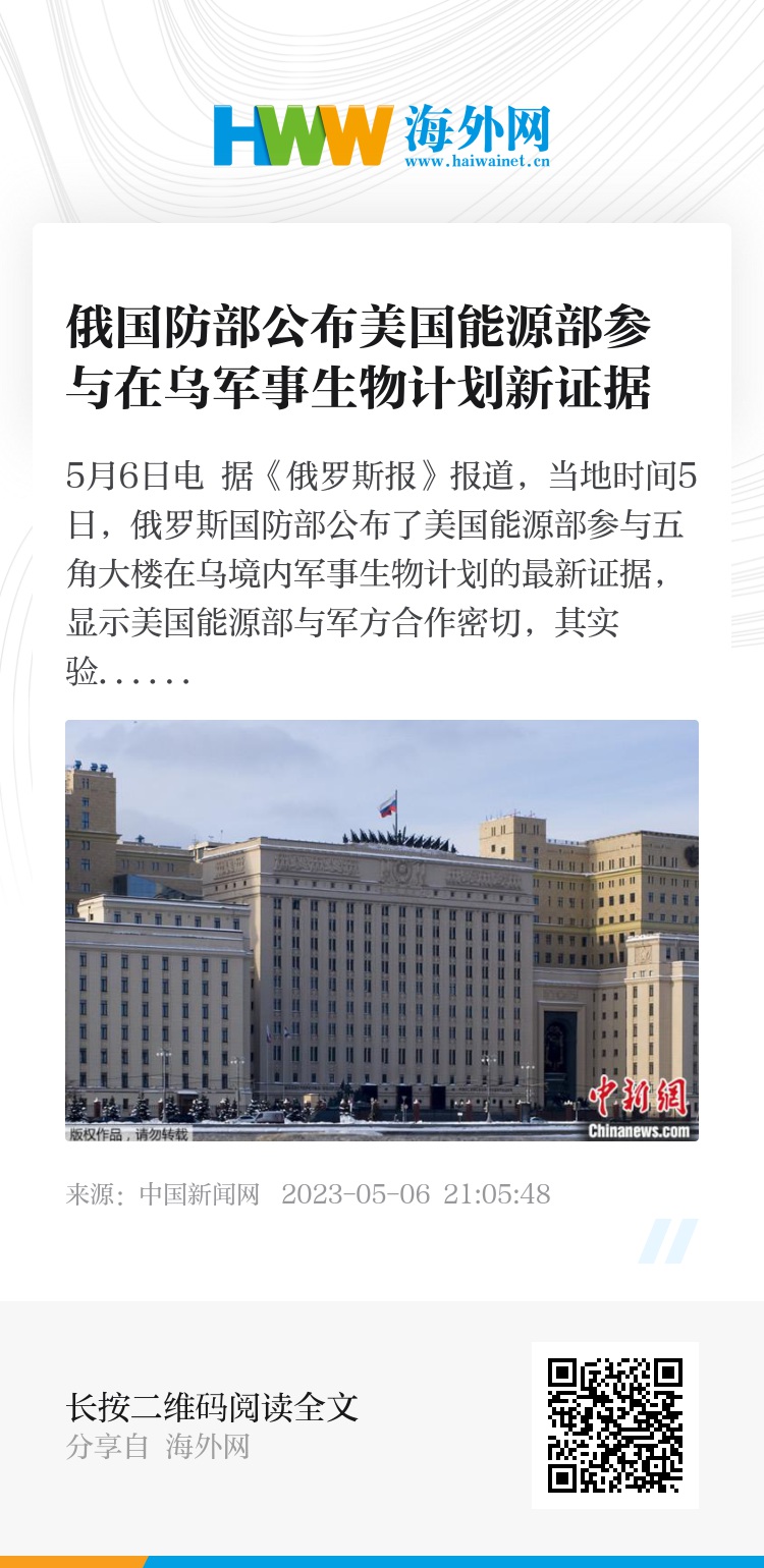 中新网5月6日电 据《俄罗斯报》报道,当地时间5日,俄罗斯国防部公布了美国能源部参与五角大楼在乌境内军事生物计划的最新证据,显示美国能源部与军方合作密切,其实验室在乌克兰直接开展工作。