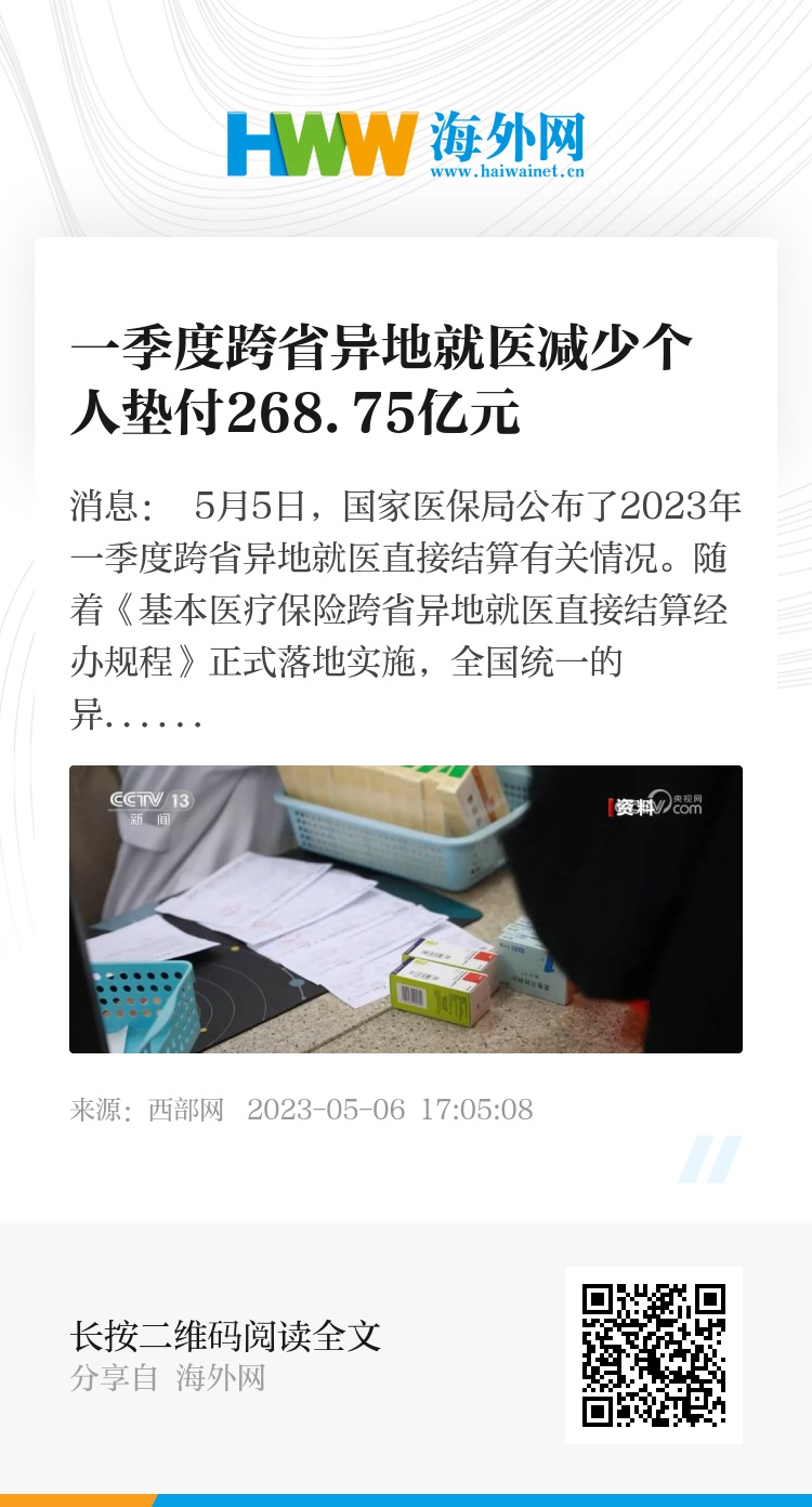 2023年一季度,全国住院费用跨省联网定点医疗机构达6.75万家,住院费用跨省直接结算212.55万人次,减少个人垫付268.75亿元,有效减轻患者垫资压力。