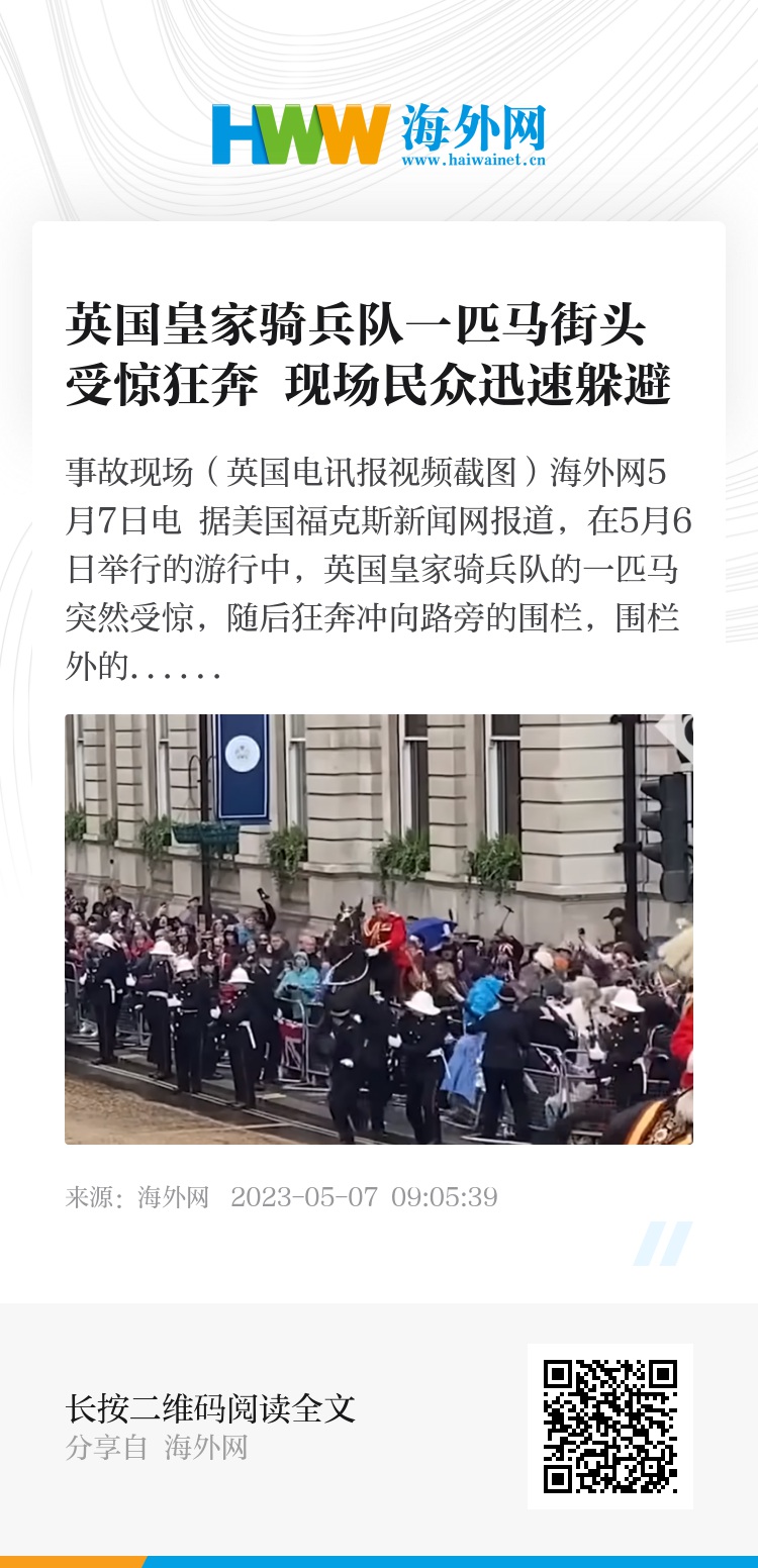 海外网5月7日电 据美国福克斯新闻网报道,在5月6日举行的游行中,英国皇家骑兵队的一匹马突然受惊,随后狂奔冲向路旁的围栏,围栏外的民众迅速躲避。