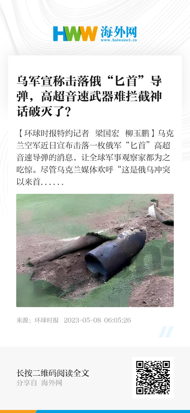 乌克兰国家通讯社6日称,乌克兰专家认为,“匕首”导弹是靠助推器加速到高超音速,但不能永远保持这样的速度。在飞行末段的攻击过程中,它的速度很快,但远不是高超音速。
